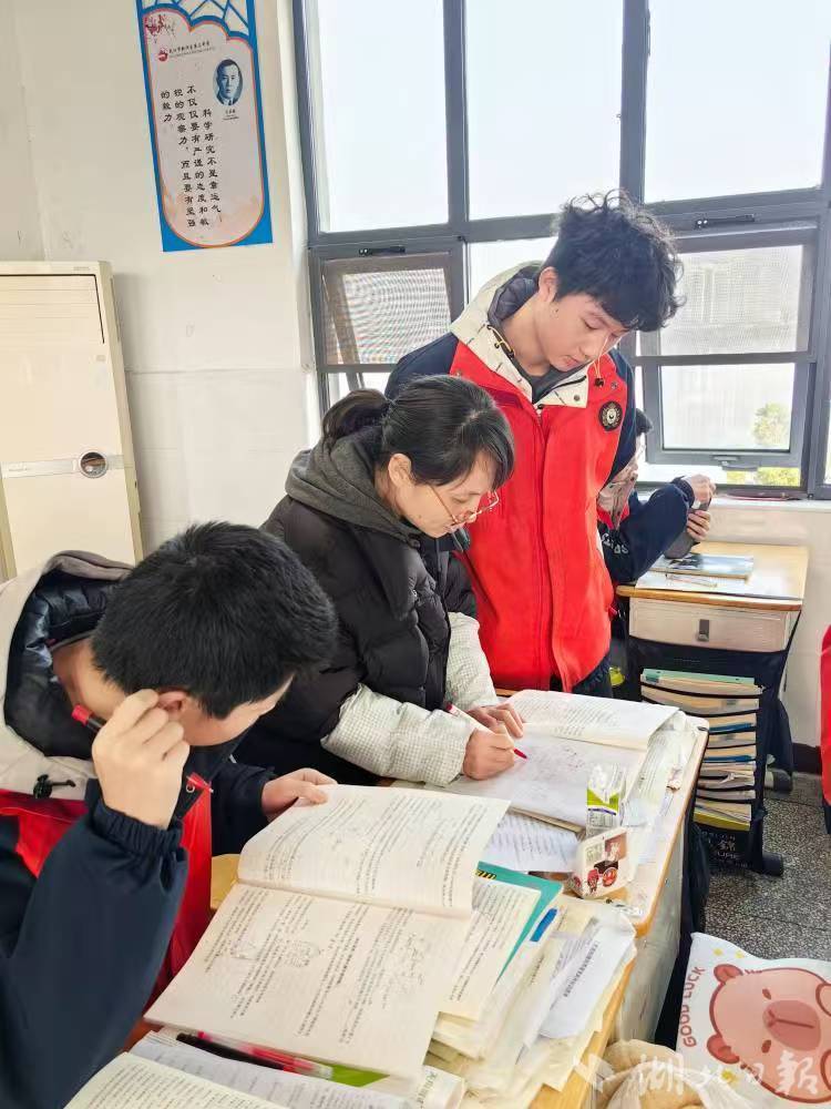 课间时分,校园的走廊瞬间变身知识的“第二课堂”。朗朗的诵读声在走廊里回荡,有的老师正专注地指导学生铿锵诵读。他们用抑扬顿挫的语调,引导学生把握每一个字音,在字音的起落间,将知识点梳理成清晰的脉络,让学生们在诵读中加深理解与记忆。不远处,几位老师围坐在临时搭建的辅导桌前,为三五学子细细剖析难题。红笔在试卷上不停圈画,轻声的讲解中,一个个难题迎刃而解。更令人感动的是,有的老师甚至俯身半蹲在教室过道,与学生保持目光平齐,一笔一划耐心地疏解思路。那专注的神情,无声地诉说着对学生最深沉的期许与关爱。
