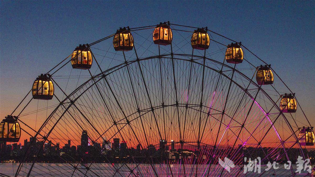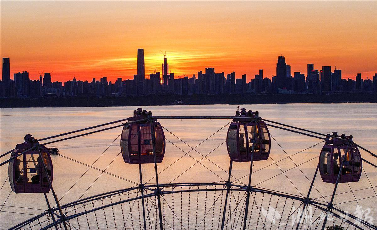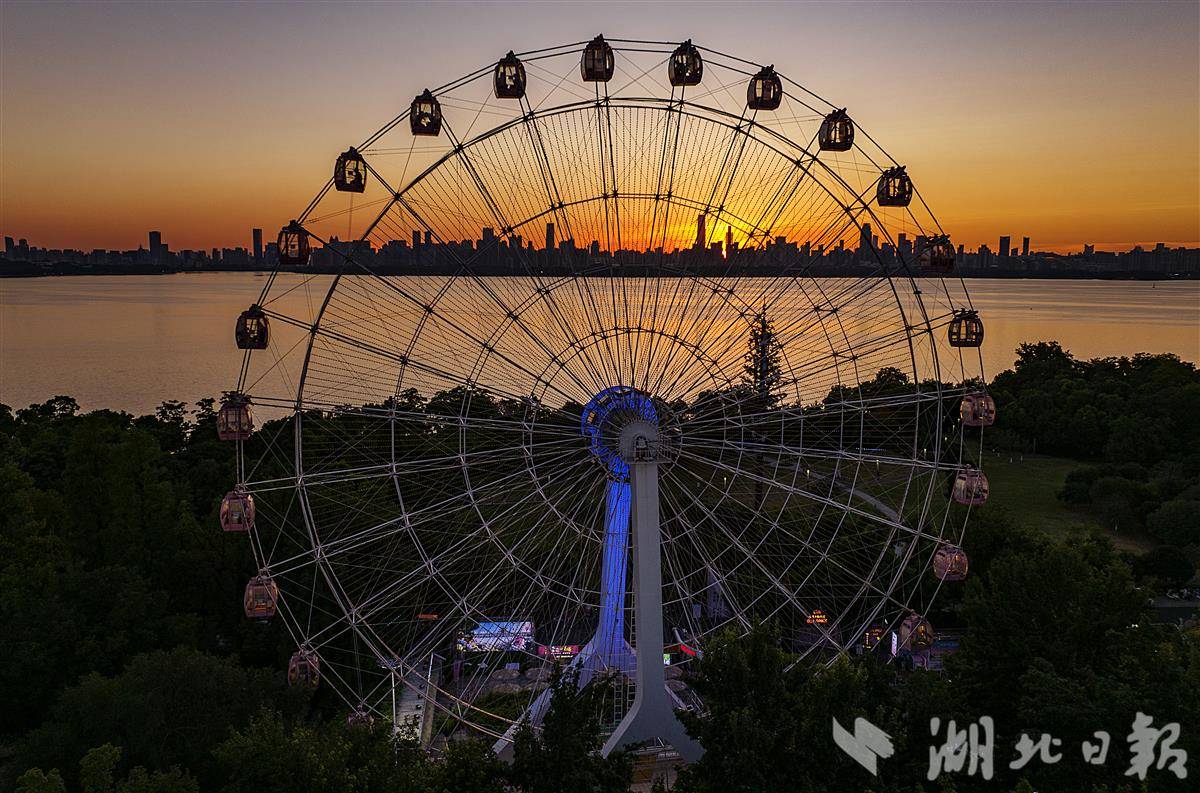 7月3日傍晚,直径49.9米的摩天轮“东湖之眼”正迎着晚霞徐徐旋转,金色霞光晕染至舱内,游客纷纷举起手机定格绝美时刻。此刻此时,便是武汉拍照的最佳新机位。(湖北日报全媒记者 朱熙勇 摄)