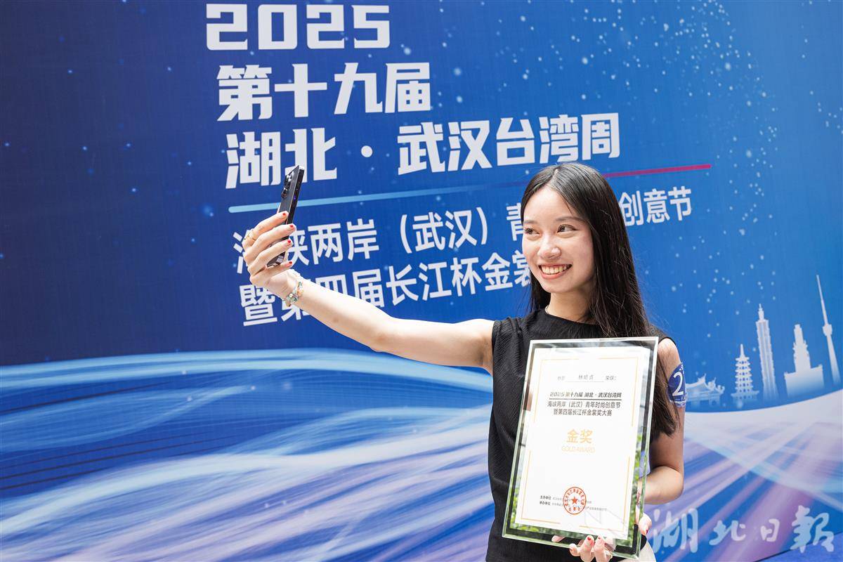 获得金奖的台湾辅仁大学学生林嬑贞拿着奖状自拍。(湖北日报全媒记者 任勇 摄)