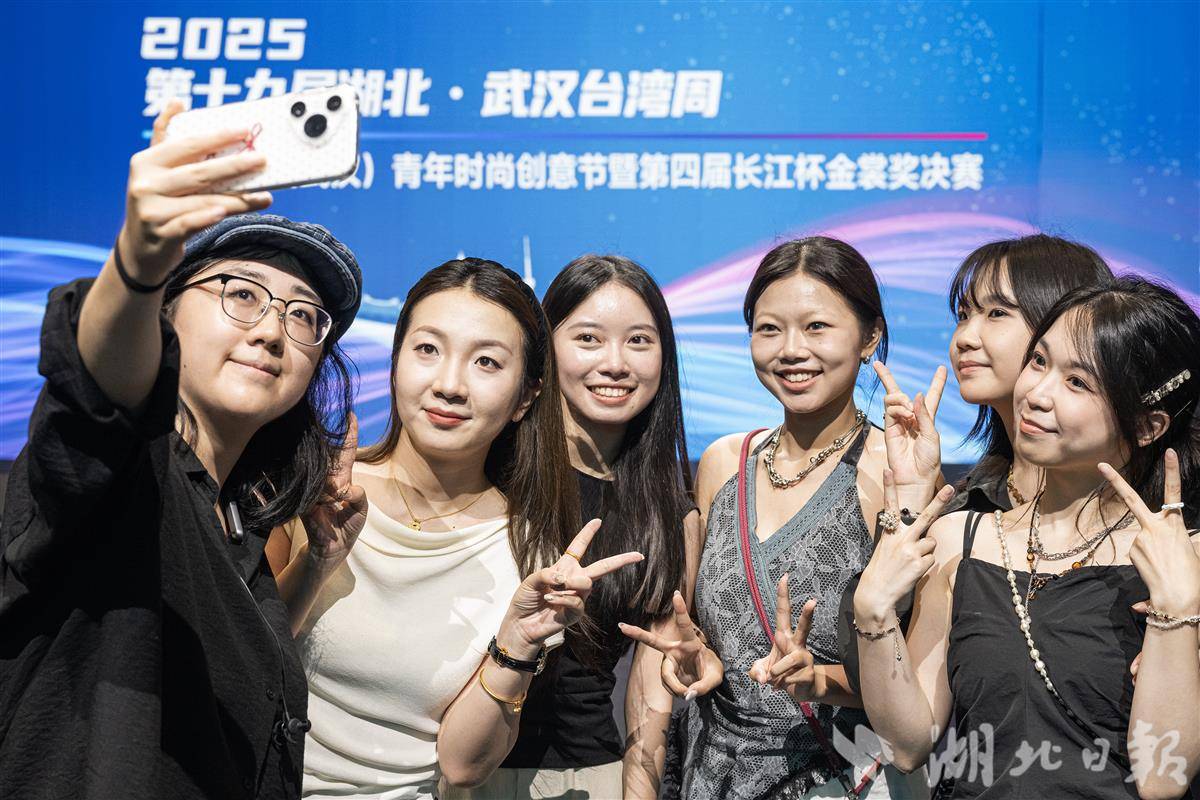 比赛结束后,武汉纺织大学学生李赟(左二)、李颖(左一)和台湾学生自拍留影。(湖北日报全媒记者 任勇 摄)