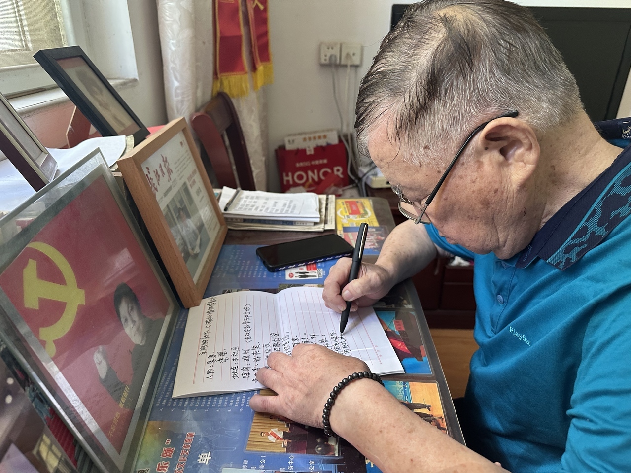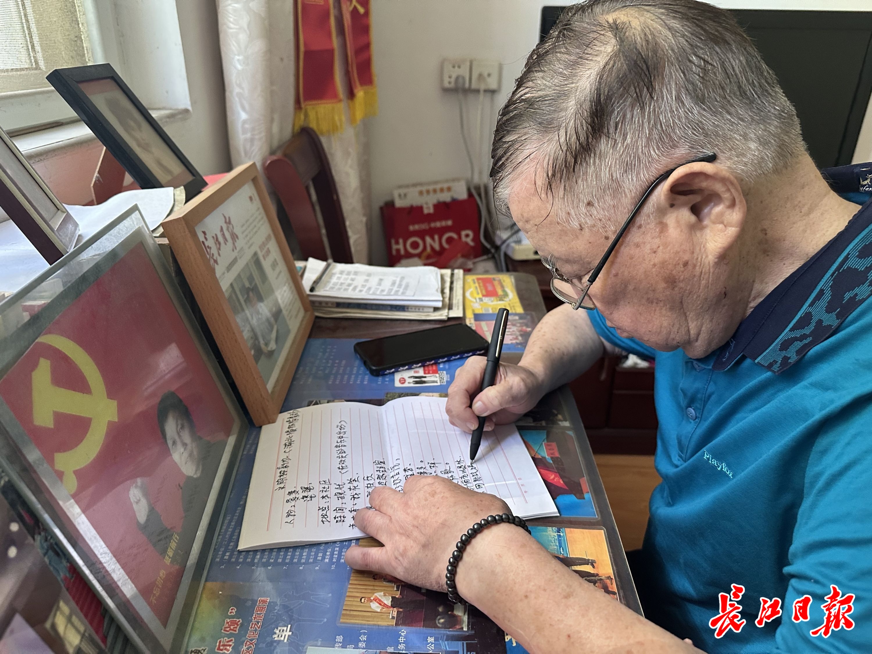 7月7日下午,青山区工人村街道青宜居社区,84岁的武钢退休工人吴传发在自己家中埋头伏案,手中的墨水笔在稿纸上沙沙作响。