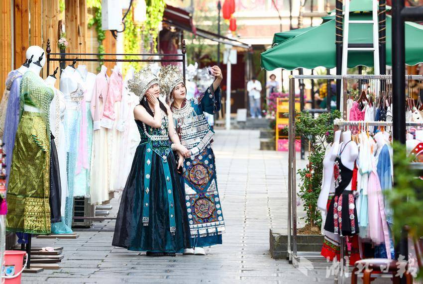 “我也在女儿城当了一回幺妹儿。”来自四川的游客杨茜以前经常刷到恩施,作为汉族的她,对土苗民族风情十分感兴趣,在导游的推荐下来到了女儿城,换上30元不限时的苗族服饰,漫步在青石板路上,随走随拍。