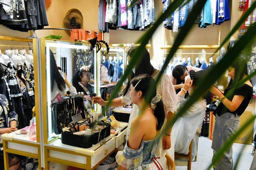“原先店里面就是卖各种女装的,后面发现旅拍这么火,我也开始到全国各地定制少数民族服饰,招纳造型师、摄影师。”王蓉说,就这样,一家名为“梧桐树”的旅拍店开了起来,店内的700多套民族服饰供不应求。