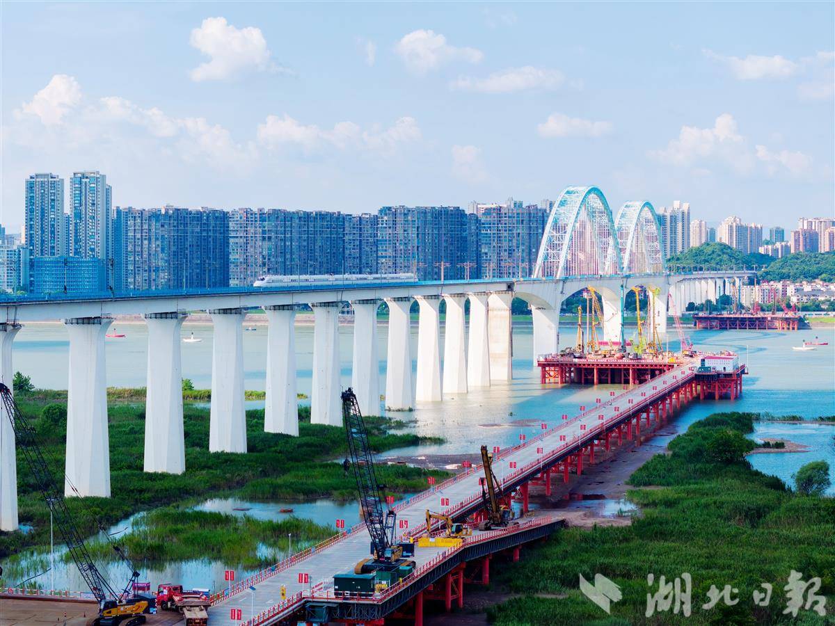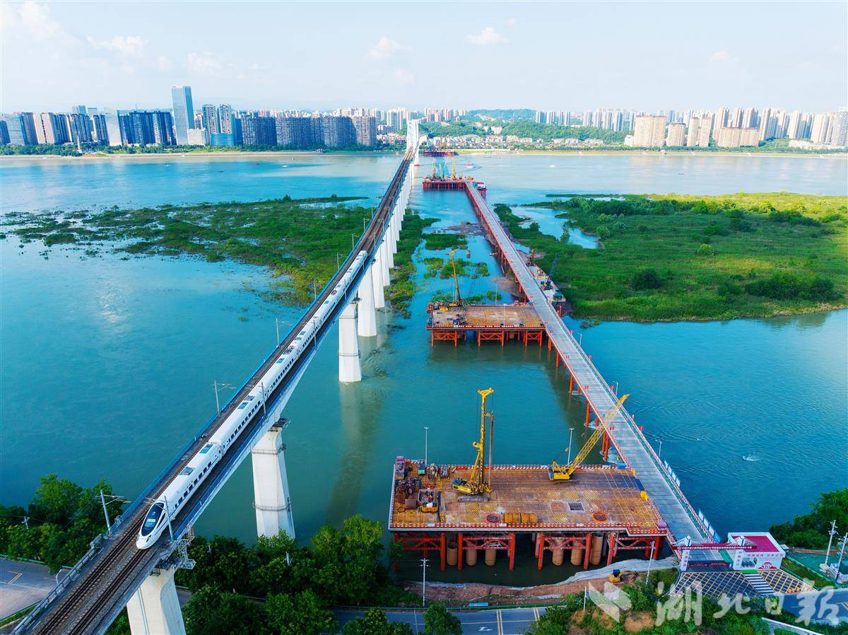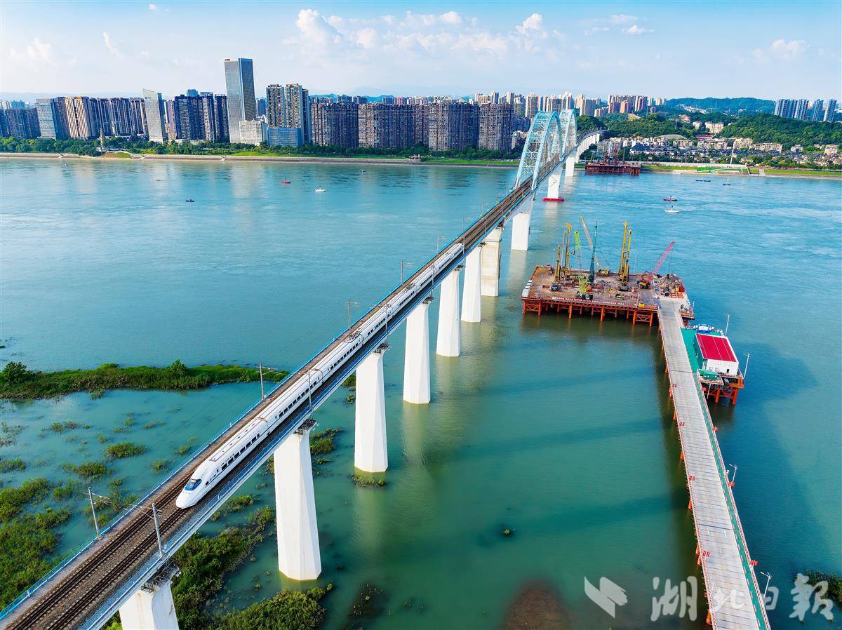 7月10日,一列动车驶过宜昌宜万铁路大桥,旁边正在施工的是沪蓉高铁宜昌长江公铁大桥建设现场,建设者正在进行桩基础施工。该公铁大桥与现有宜万铁路大桥并行,是沪蓉高铁宜(昌)涪(陵)段关键性工程。据施工单位中铁大桥局介绍,大桥采用主跨800米斜拉桥方案,上层建4线铁路,下层建6车道城市主干道,两侧预留城市轨道交通空间,充分考虑了未来城市发展需要,建成后将提升宜昌枢纽地位,促进区域经济融合。(视界网 王耿 摄)