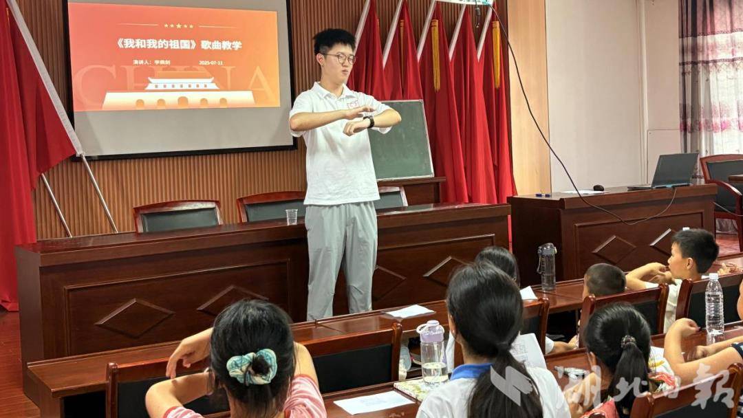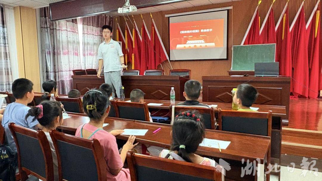 7月11日,麻城市白果镇渡桥村“爱心托管班”创新开设红色音乐课堂。黄冈师范学院初梦公益团队志愿者通过教唱《我和我的祖国》及手势舞教学,将爱国主义教育融入艺术实践,为少年儿童们带来沉浸式红色文化体验。