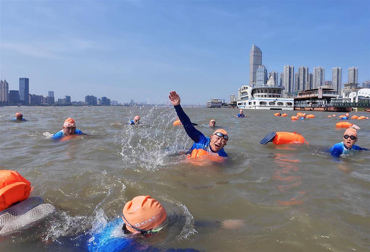 群众横渡方阵里的游泳爱好者正游向起水点。(湖北日报全媒记者 何蕙亦 摄)