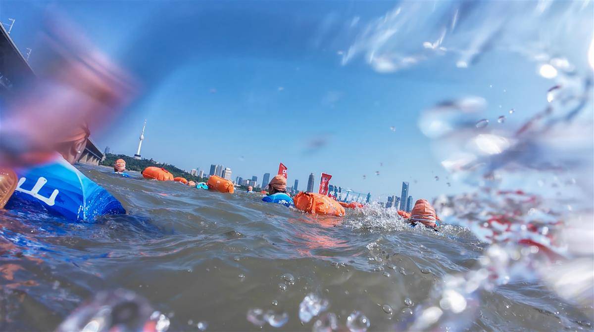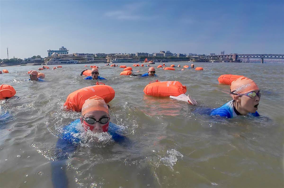 群众横渡方阵里的游泳爱好者在长江劈波斩浪、奋力向前。(湖北日报全媒记者 何蕙亦 摄)