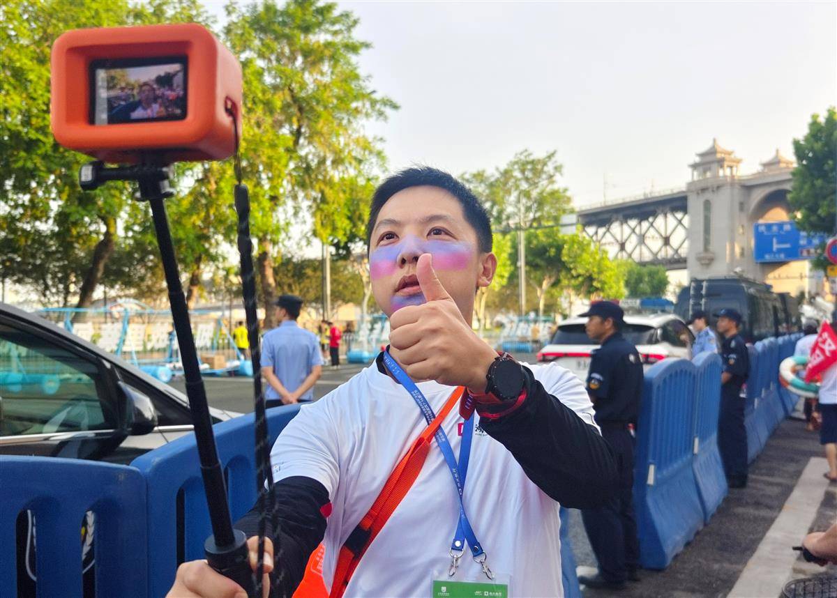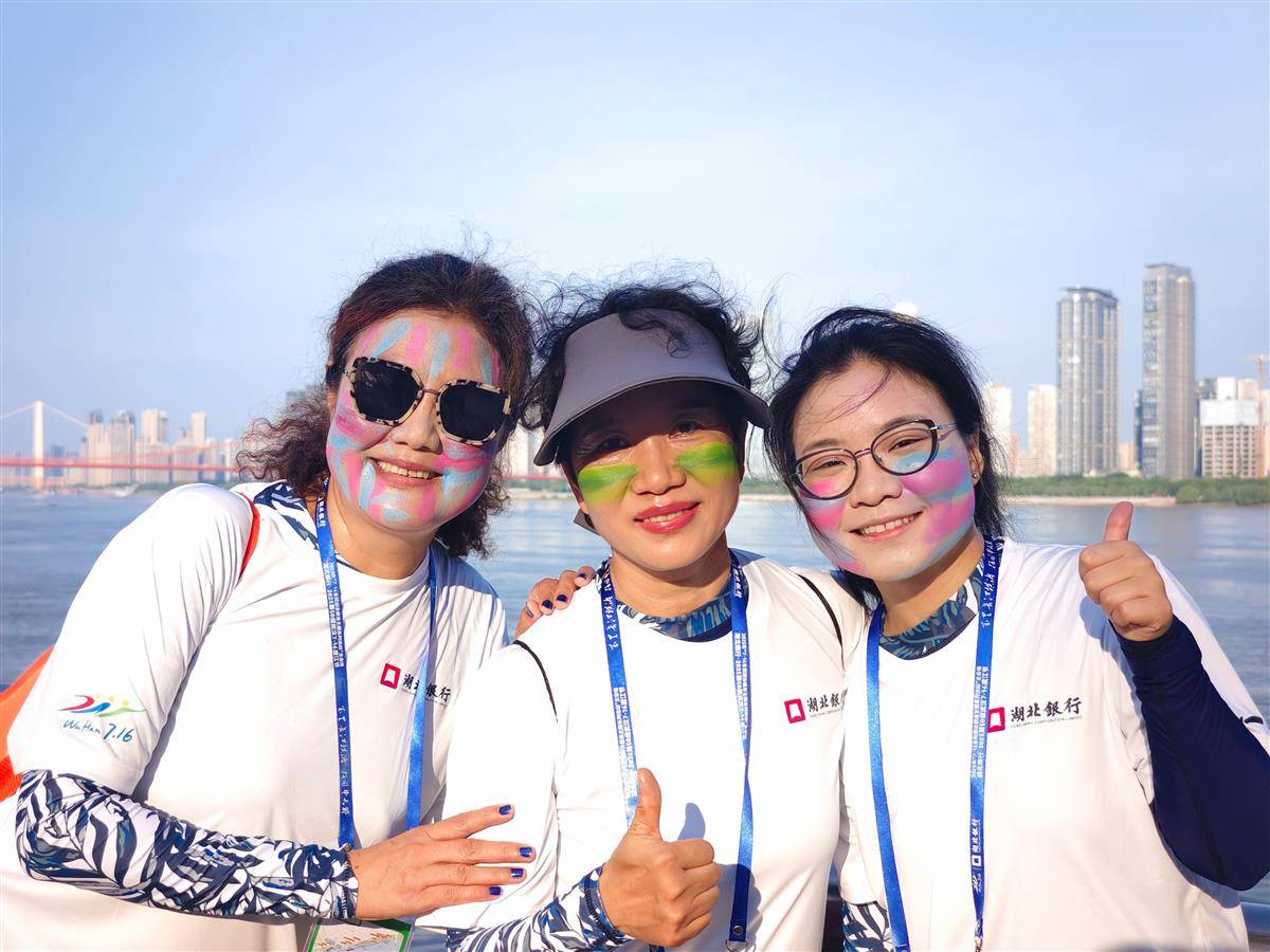 游泳爱好者脸上涂上彩妆,准备横渡长江。