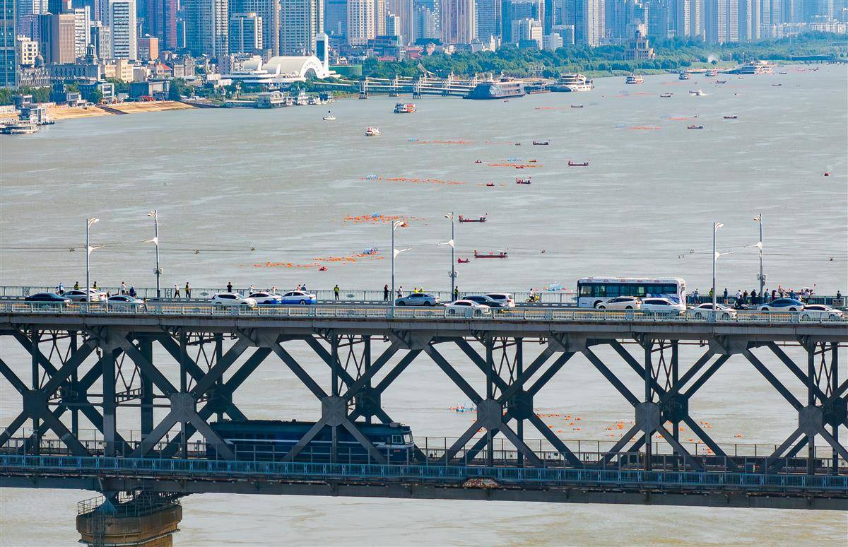 市民和游客在武汉长江大桥桥面观摩渡江节盛况。