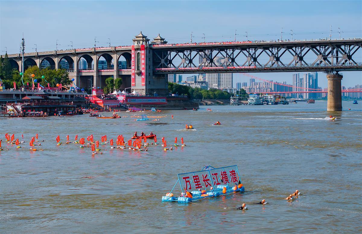 7月16日,2025第50届武汉7·16渡江节启幕。70名来自中国各地以及俄罗斯、意大利、英国等国游泳健将,参加了约1800米个人抢渡长江挑战赛;2000余名游泳爱好者组成27个方阵,完成约6000米游程。武汉渡江节从1956年至今,已成功举办50届,成为中国内地最具影响力的公开水域游泳赛事之一。(湖北日报全媒记者 柯皓 摄)