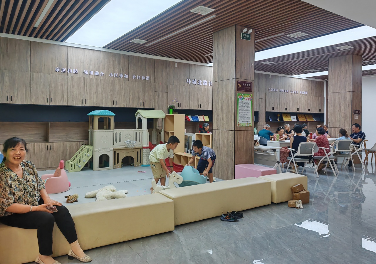 记者注意到,虽然大厅里人来人往,老人闲聊,孩子玩耍,还有人安静地看书,但整个空间却显得井然有序。现场社区工作人员和身着红马甲的志愿者,目光始终关注着全场。他们或为老人续上热水,或引导新来的居民,或轻声提醒孩子们注意安全。