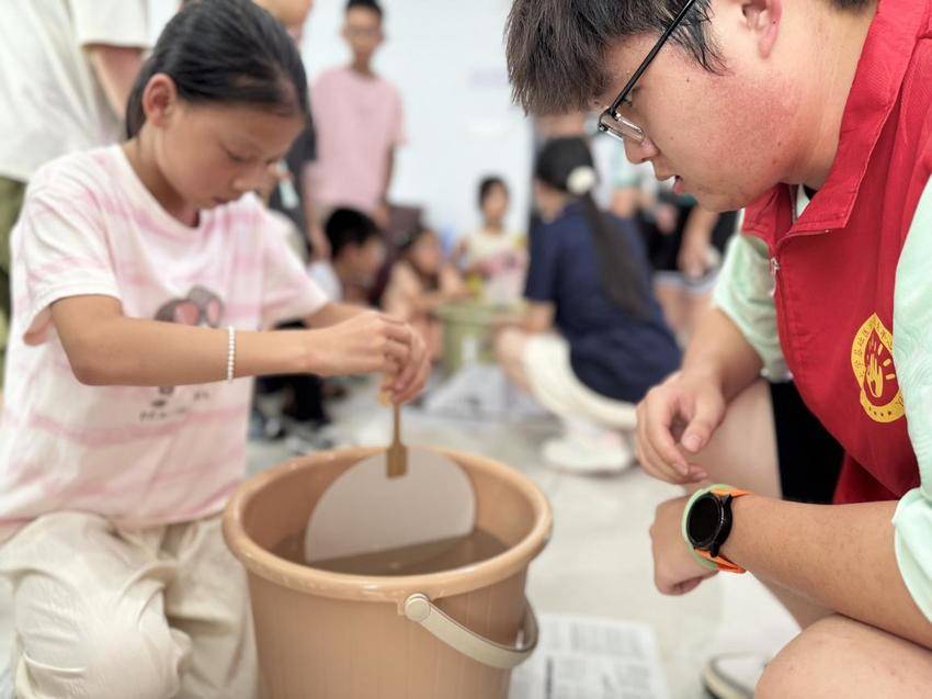 在实践环节,志愿者耐心指导孩子们勾勒轮廓、调配色彩并制作漆扇。从冷暖色系的对撞,到点金工艺的创新,孩子们进行传统技法与现代审美的融合创作。经过孩子们的创作,原本素净的扇面变成了一幅幅充满童趣的作品,他们兴奋地展示着自己的非遗作品。