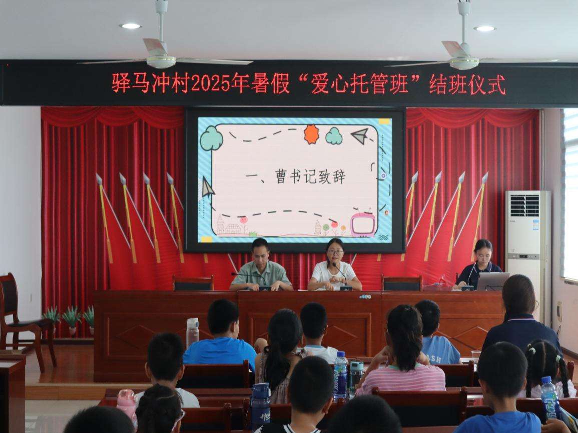 驿马冲村党委书记曹小兰出席仪式并讲话:“大学生志愿者用知识启迪智慧,用陪伴传递温暖,为辖区儿童搭建了成长的‘第二课堂’,这既是对‘双减’政策下课后服务的有益补充,更是新时代青年扎根人民、奉献社会的鲜活写照。”