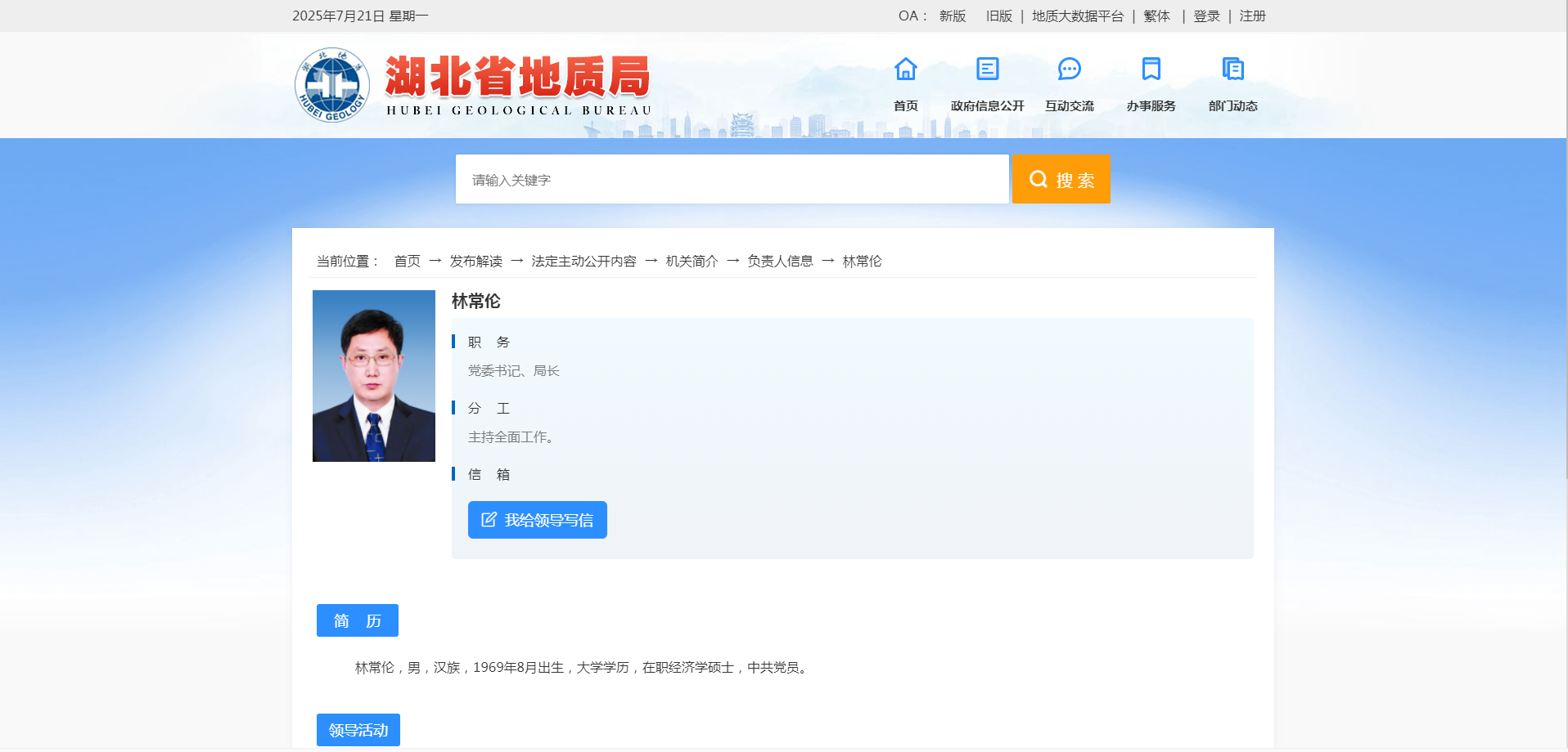 湖北日报讯(记者林晶)7月21日,湖北省地质局官网“负责人信息”一栏显示,林常伦任湖北省地质局党委书记、局长,主持全面工作。此前,林常伦任湖北省委国安办常务副主任。