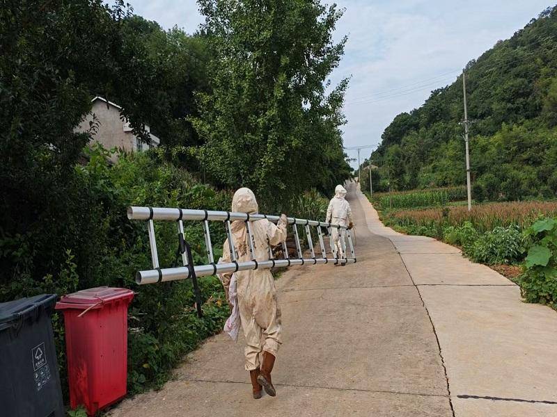 宜都市消防救援大队闻警即动,迅速调派专业处置力量携带装备赶赴现场。消防指战员们顶着高温,对蜂巢展开逐一“侦察”,发现有的马蜂窝高悬在屋檐下,有的马蜂窝深藏在房屋附近的树冠中,根据蜂窝所在不同位置,消防指战员身着密实的防蜂服,娴熟运用专业工具,或火攻、或套袋,精准实施摘除作业。在短短两小时内辗转数个村落,连续成功摘除10余处马蜂窝,彻底消除了困扰村民的安全隐患。