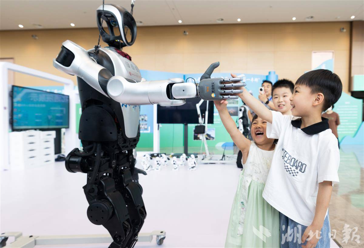 7月22日,乐聚机器人“小鄂哥”亮相鄂州人才周,和小朋友们互动。