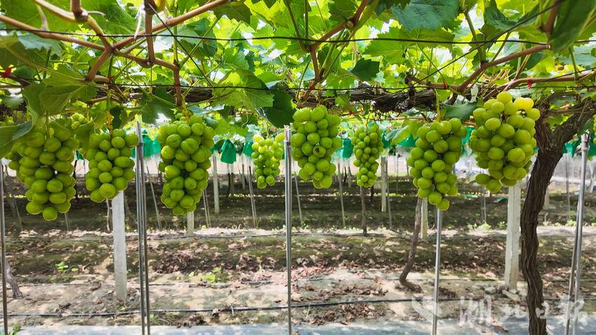 盛夏时节,硕果飘香。在白霓镇杨洪村的铁强葡萄园,一串串饱满多汁的巨峰、阳光玫瑰葡萄挂满枝头,静待游客前来体验采摘乐趣,共享这份“甜蜜”时光。