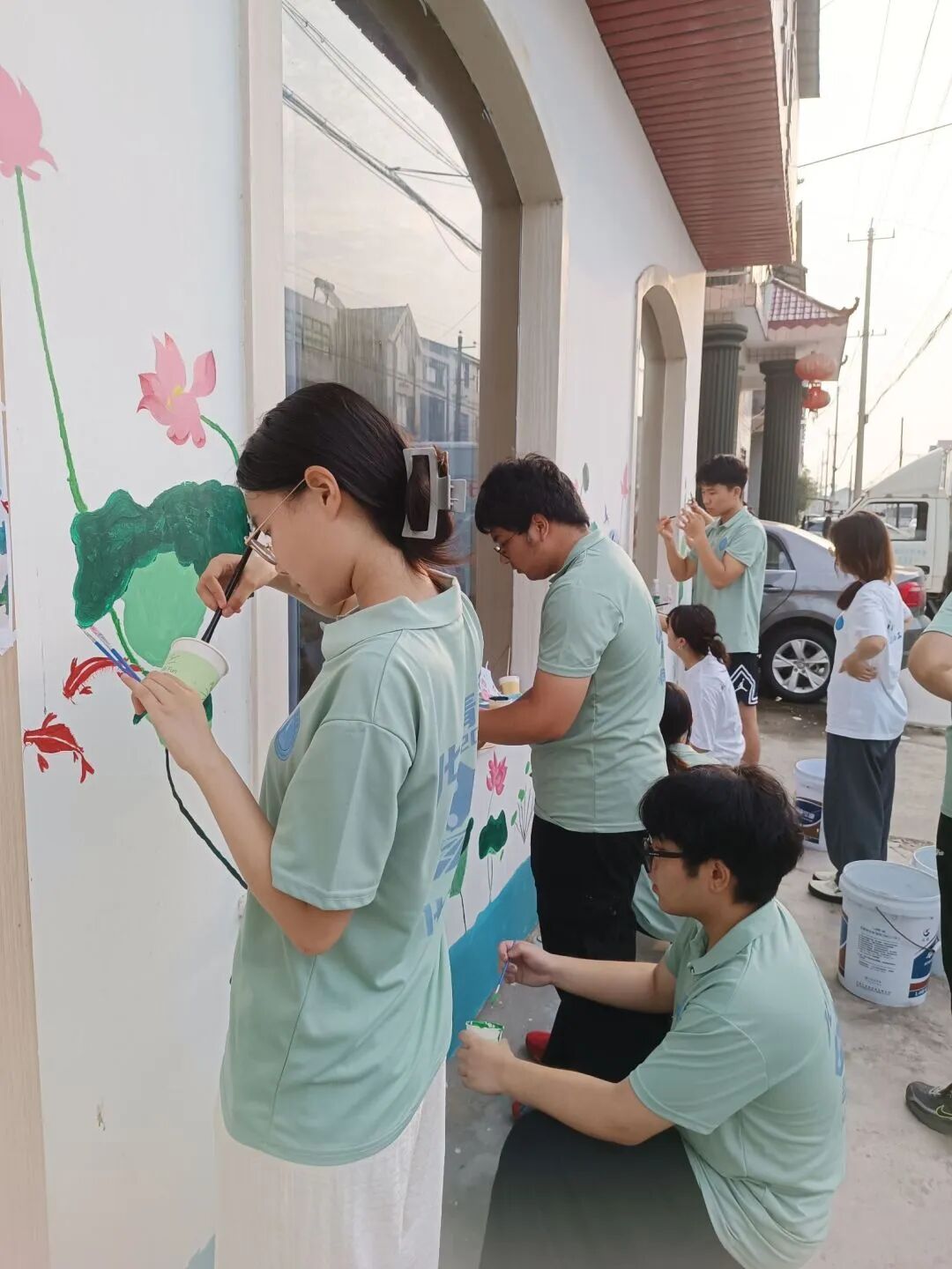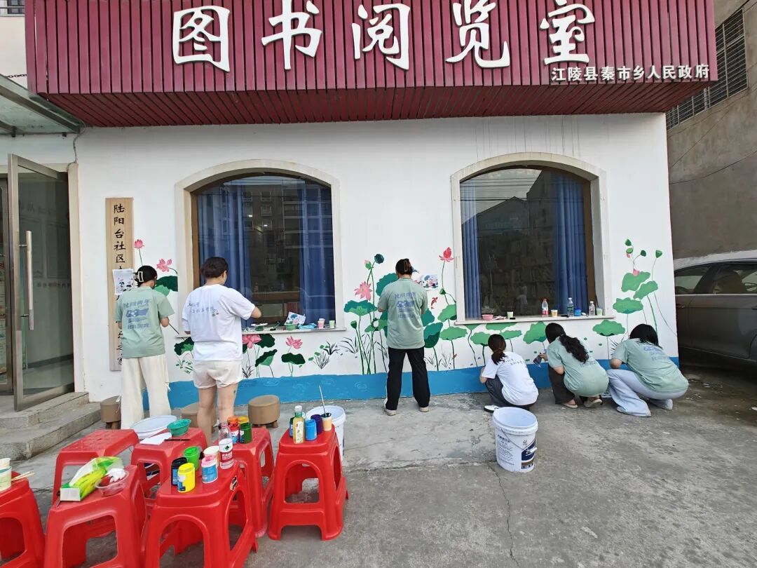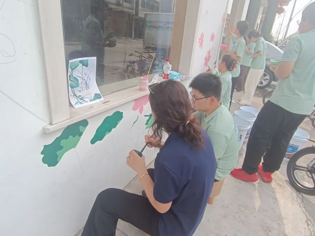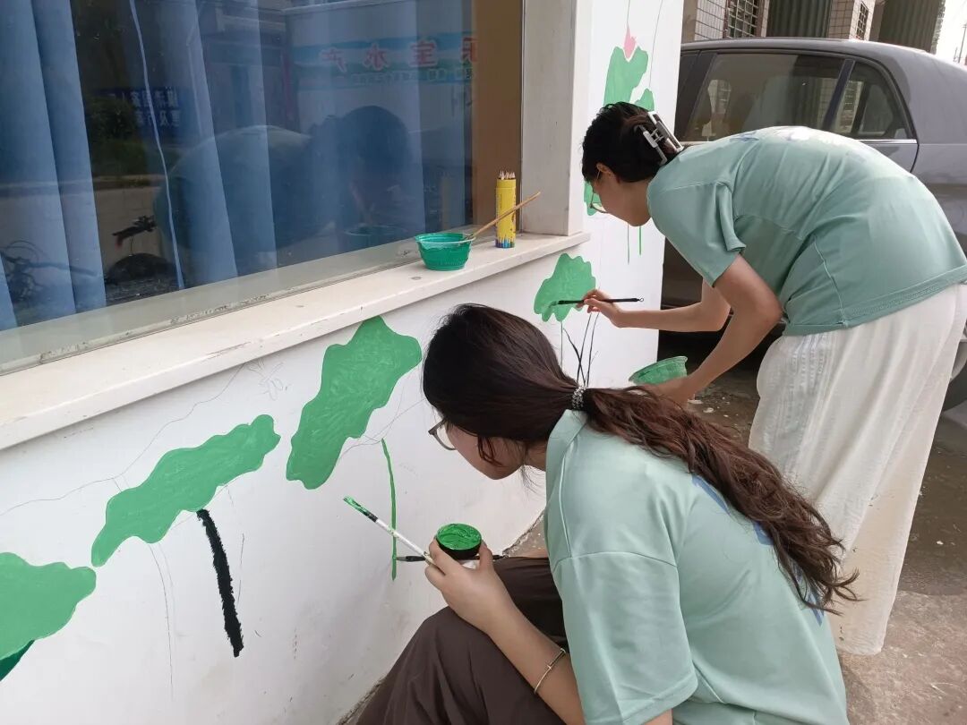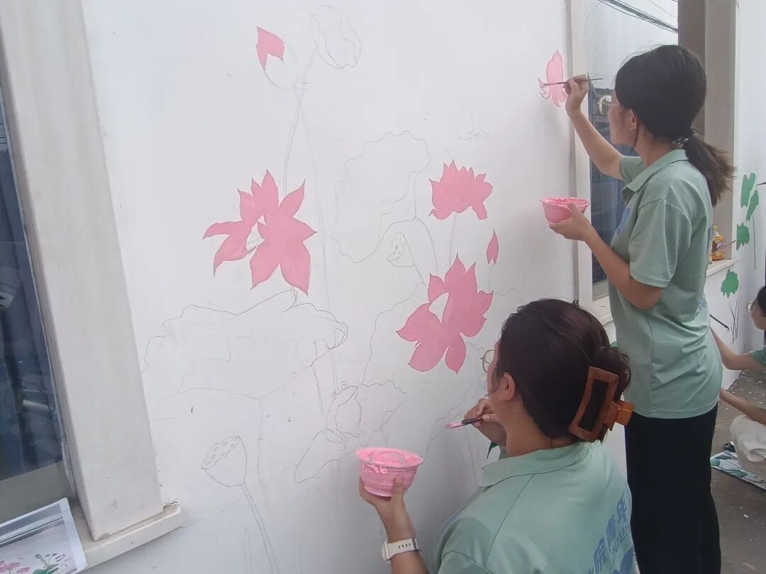 活动当日,阳光热烈,却丝毫未减实践团成员们的热情。他们早早抵达爱心托管班门口的白墙前,迅速投入到准备工作中。调色盘里色彩缤纷,画笔整齐排列。在辅导员老师的带领下,实践团成员们分工明确、配合默契。有的负责勾勒轮廓,用流畅的线条描绘出美轮美奂的荷塘、灵动活泼的游鱼、栩栩如生的蝴蝶以及清澈的水波;有的专注于上色,精心调配色彩,为大大小小的荷叶添上翠绿,为粉色渐变的荷花晕染出细腻的层次。