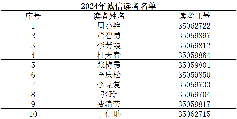 为进一步健全守信激励机制,助推全县文化行业信用体系建设,江陵县图书馆自2022年起实施“信易+阅读”方案。该方案旨在充分发挥公共图书馆的阅读服务功能,助力全民阅读深入开展。现依据此方案及相关评选标准,确定2024年度诚信读者名单如下: