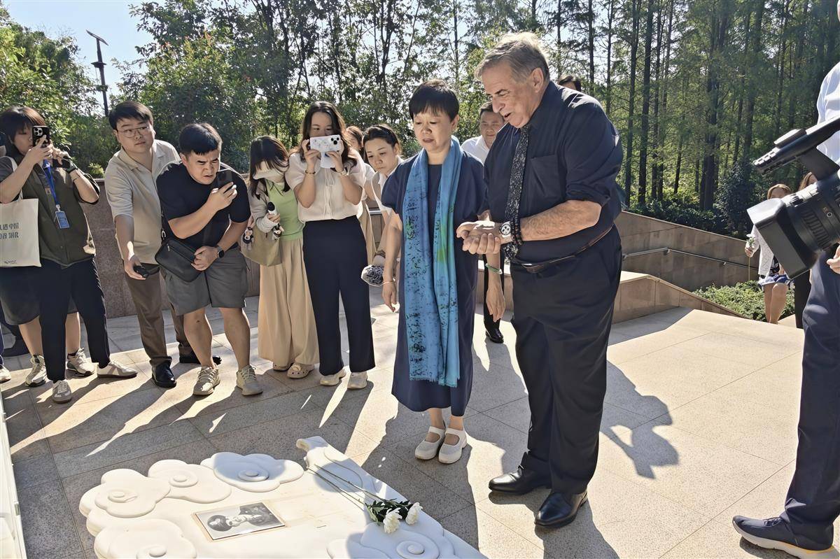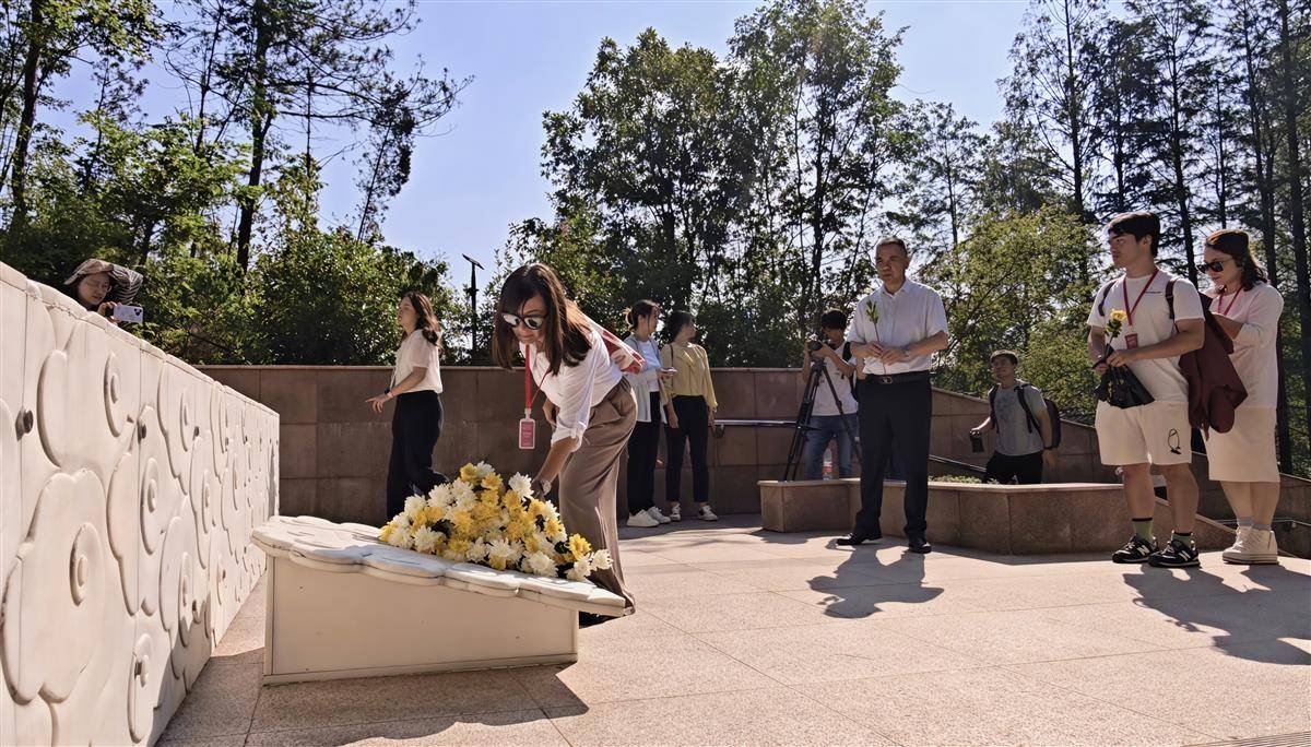 7月28日上午,美中航空遗产基金会主席杰夫·格林、飞虎队老兵后代安娜·安东尼娅·李一行与近百名美国“飞虎队”青少年夏令营成员在本尼达墓前献花。(湖北日报全媒记者 陈少哲 摄)