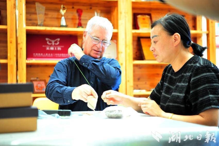 ↑ 在宜昌市夷陵区太平溪镇许家冲村非遗工坊,自媒体博主澳大利亚籍的Jeery体验点赞三峡“牵花绣”技艺。