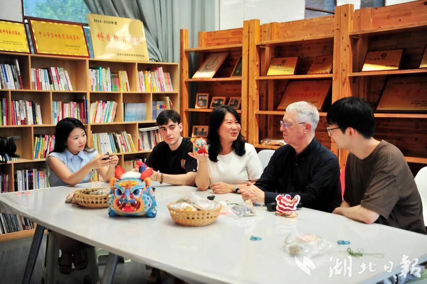↑ 在宜昌市夷陵区太平溪镇许家冲村非遗工坊,自媒体博主韩国籍定居宜昌的陈荣恩(左二)、巴西籍湖北大学留学生马飞龙(右二)一起体验三峡“牵花绣”技艺。