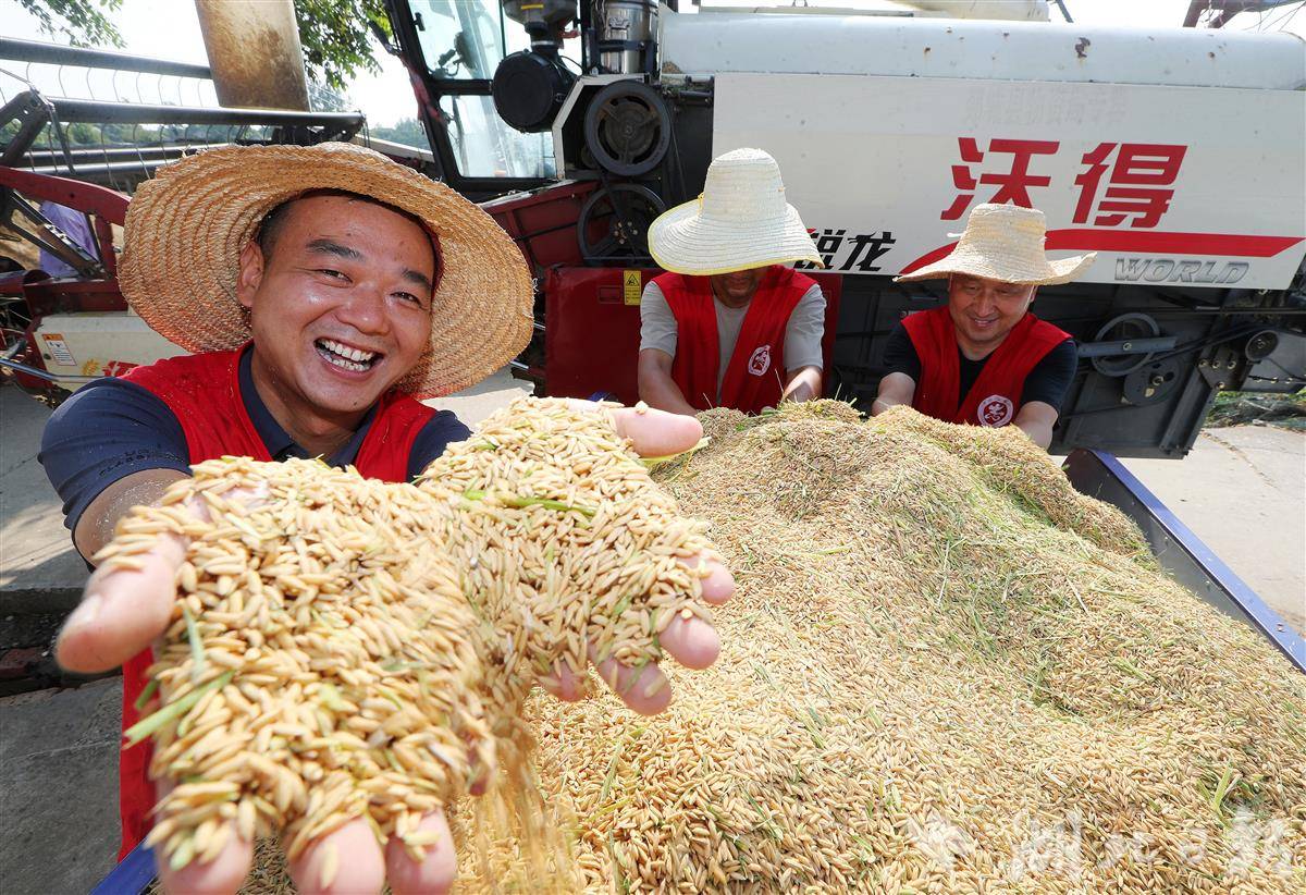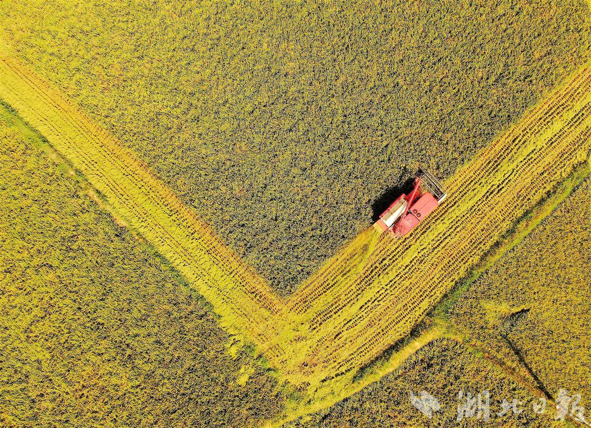 7月30日,沙洋县毛李镇毛李村的金黄稻田里,收割机来回穿梭。该县40万亩再生稻全面开镰收割,翻滚的稻浪与忙碌的机械交织,构成一幅生动的丰收画卷。