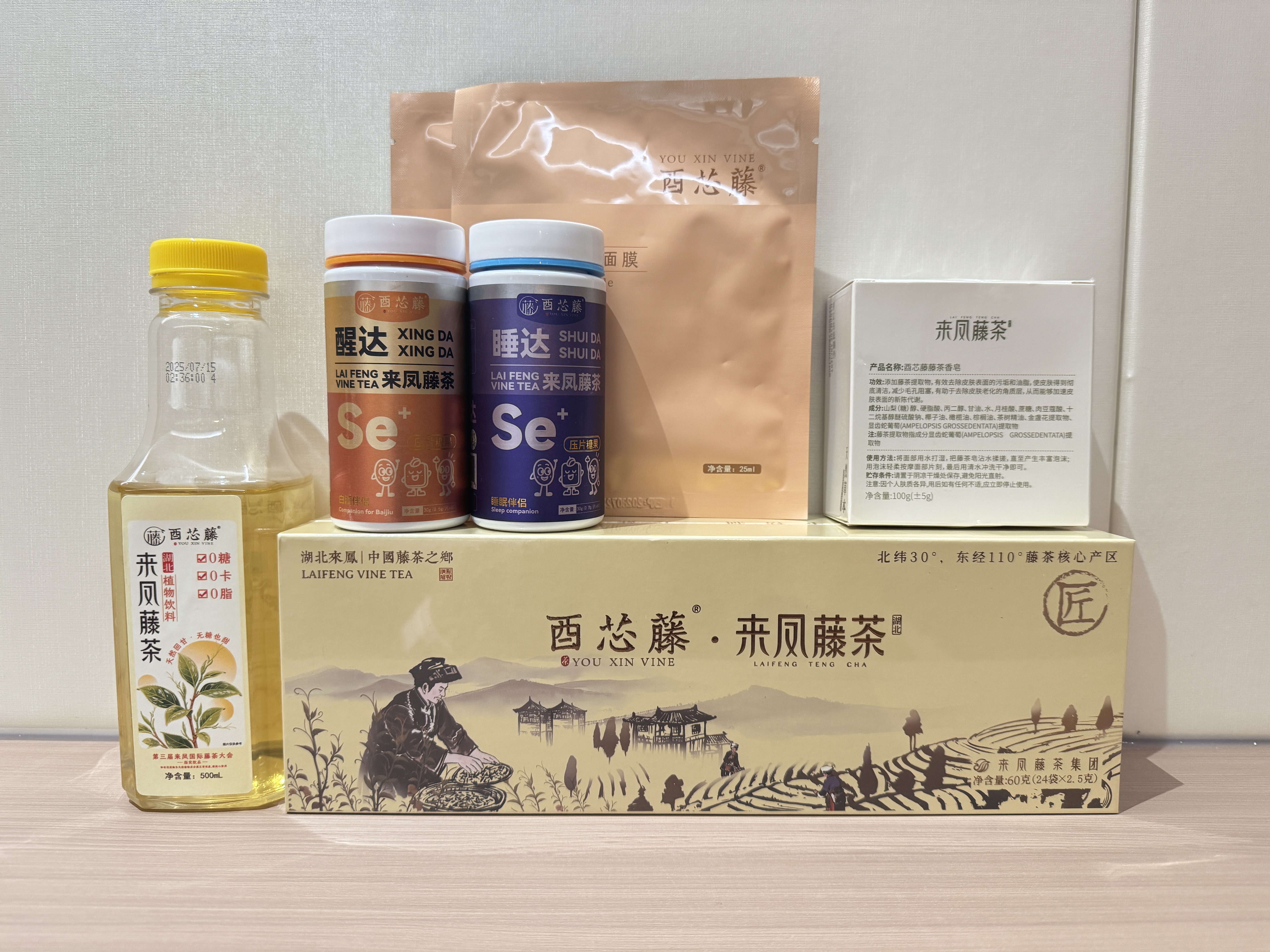 翻包的过程,也是被“来凤藤茶”品牌反复“刷屏”的过程。饮料瓶、面膜袋、糖果盒……每一件产品包装上都醒目地印着这四个字。从第一届大会各家企业单打独斗,到如今在县属国企来凤藤茶集团的链接下,“来凤藤茶”这一品牌已成为所有产品的主心骨。