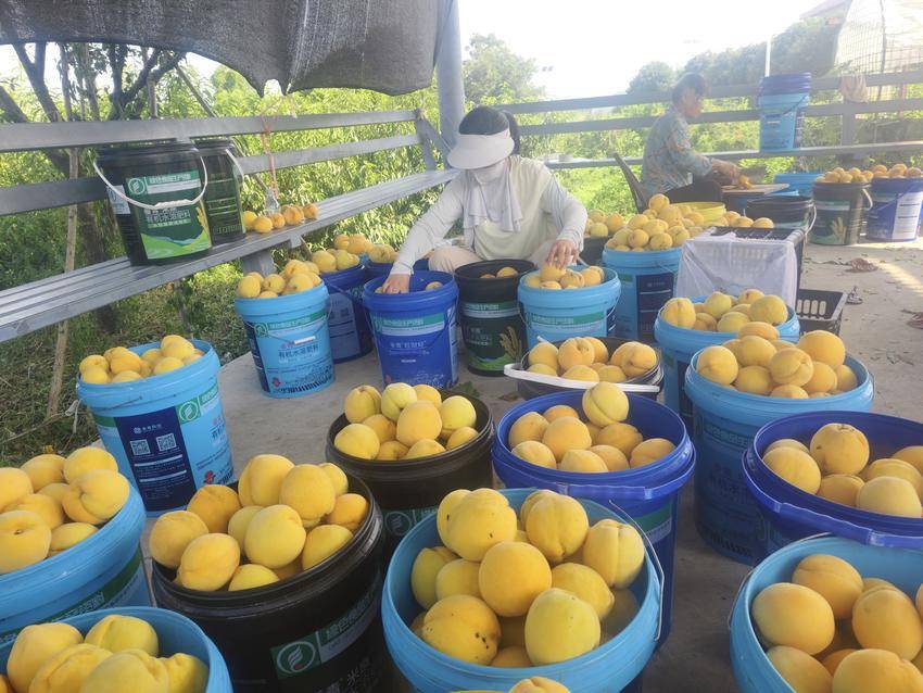 “老板,老规矩,来20斤狗血桃!今年都来4回了,全家就认准你家这口!”鄂城廖女士摇下车窗熟稔地招呼。熊志敏一边应和,一边麻利地称重。旁边做线上销售的人员正在分拣,熊志敏的母亲则把有问题的桃子切成小块喂鱼。今年桃园预计产量50万斤,线上线下销售已突破80万元。
