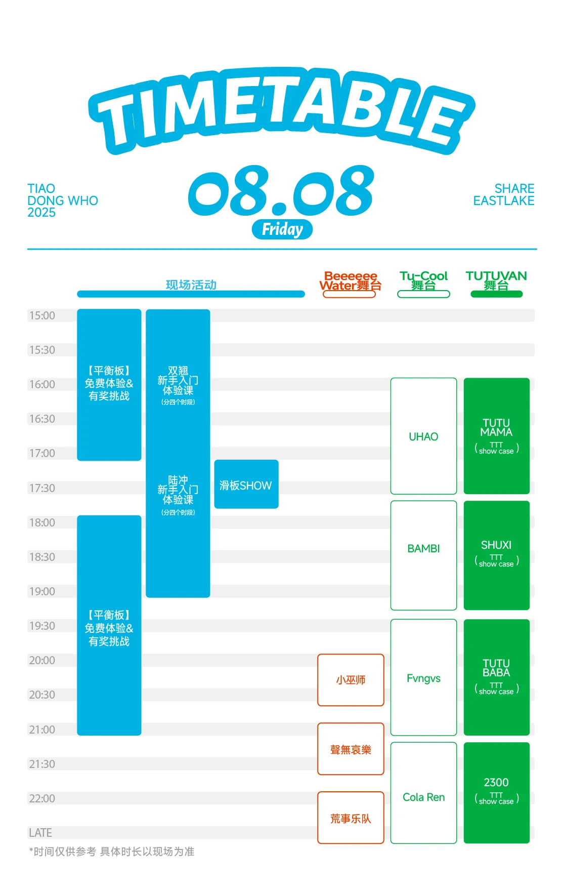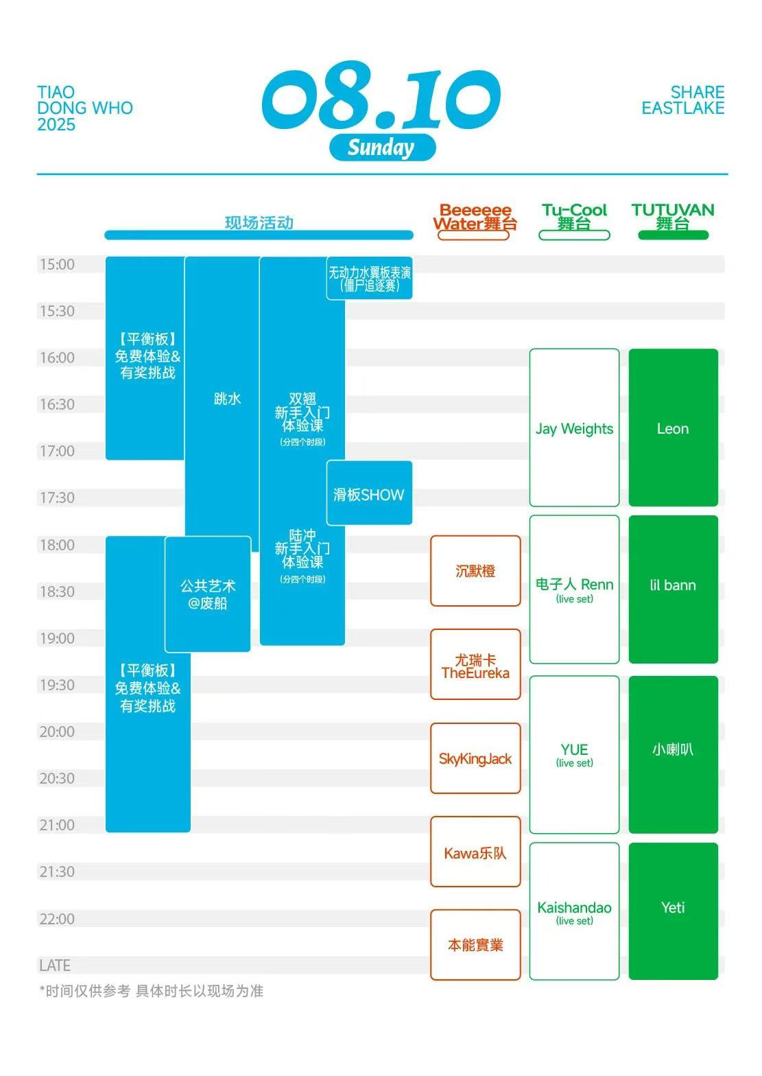今年增加一天活动前夜音乐派对,音乐现场升级为3大舞台,由1个主舞台加上2个电子音乐舞台构成。邀请37组音乐人,每天下午4点起持续6小时音浪不停。最受欢迎的跳水活动在8月9日至10日举行,新增无动力水翼表演环节,更添活动观赏性。
