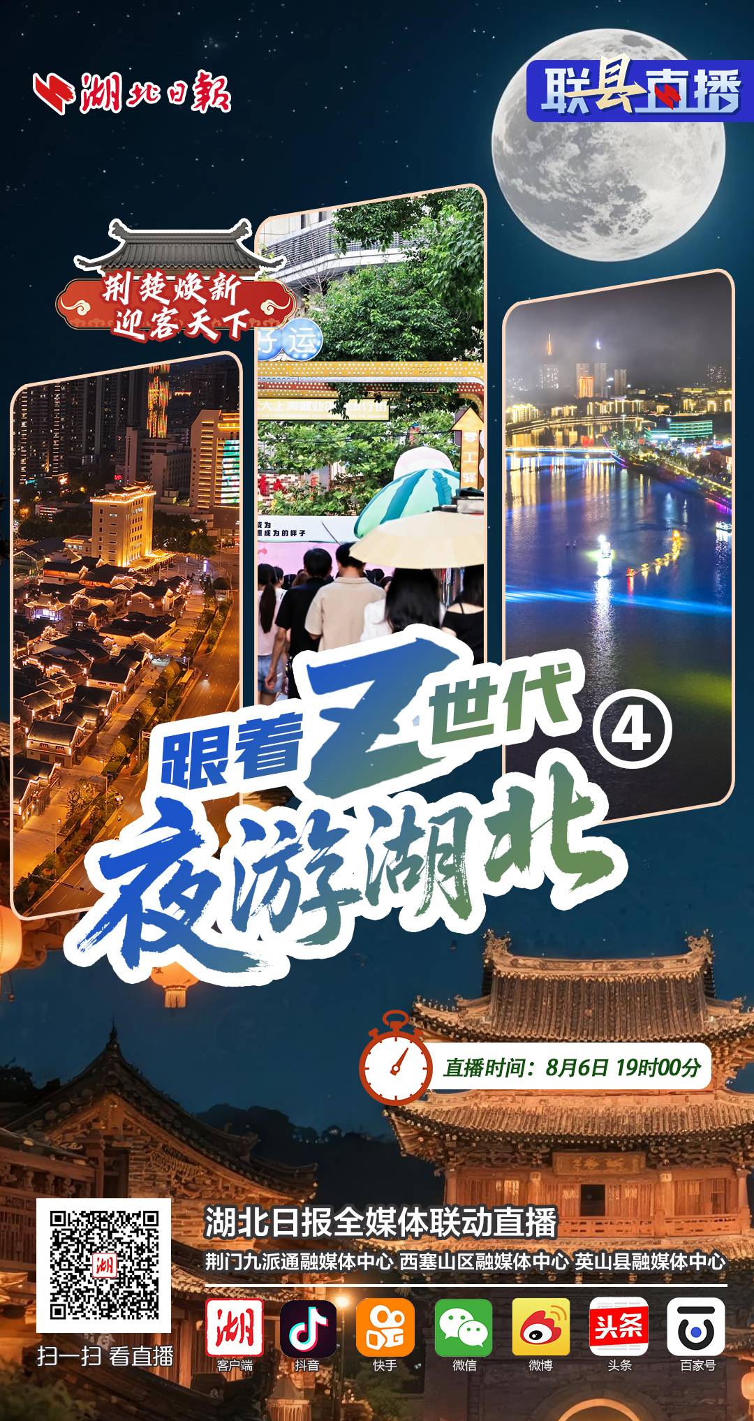 8月6日19时,湖北日报联动荆门九派通融媒体中心、西塞山区融媒体中心、英山县融媒中心开启联“县”直播《荆楚焕新 迎客天下·跟着Z世代夜游湖北》第四期。