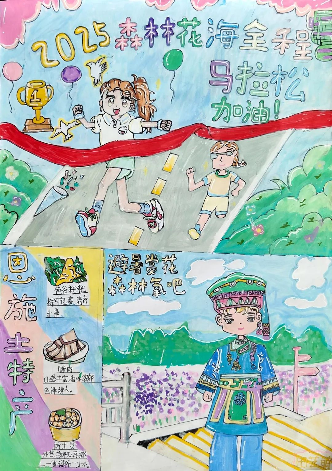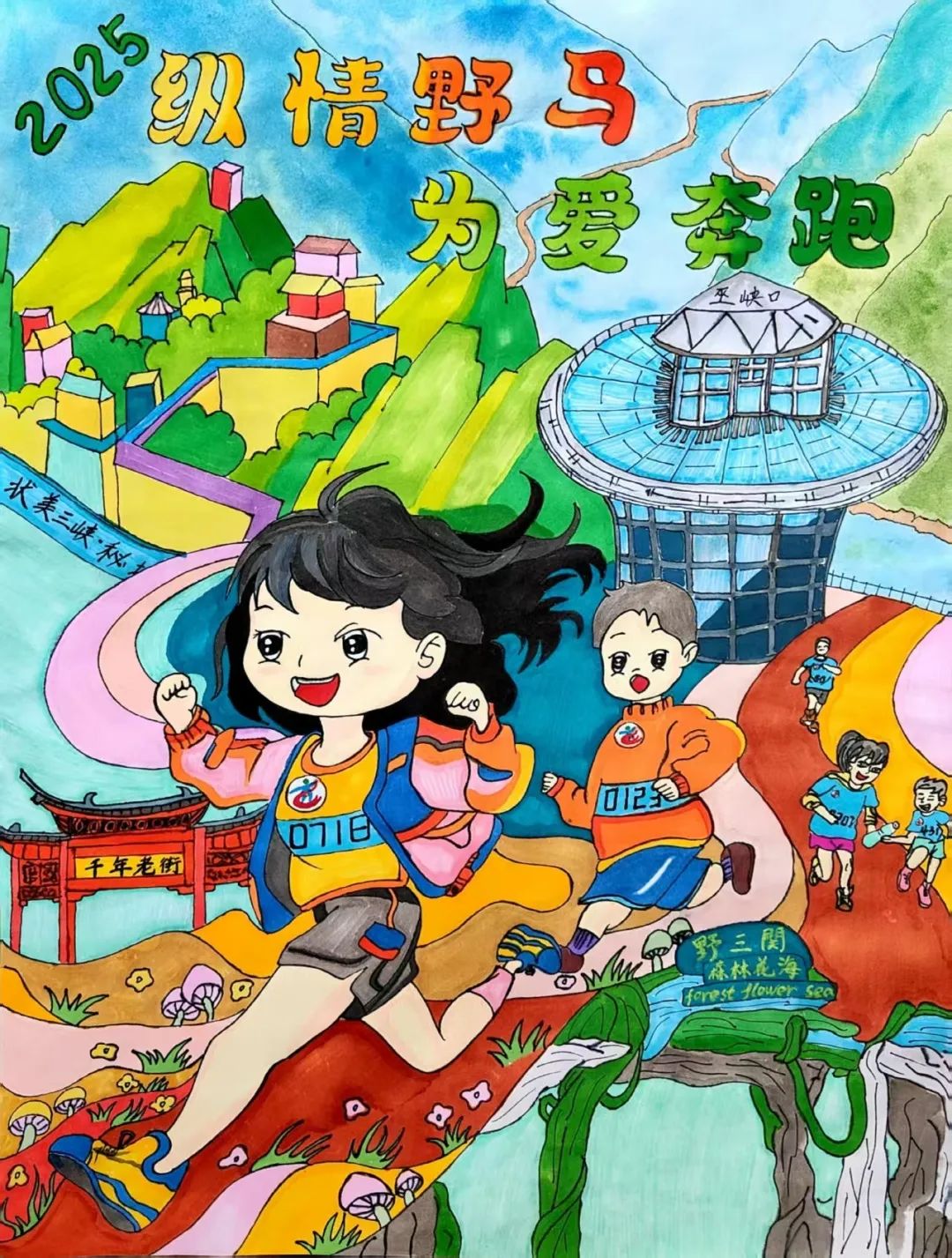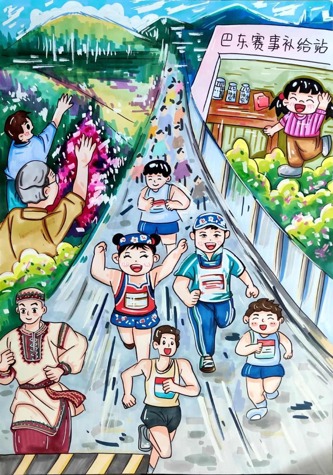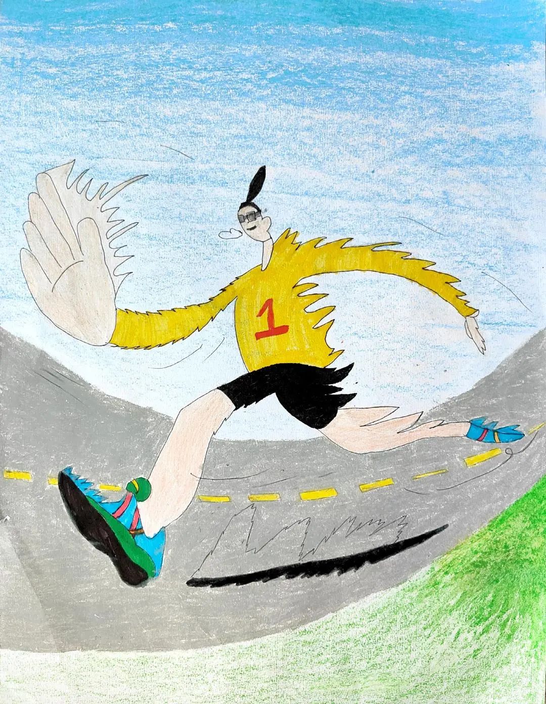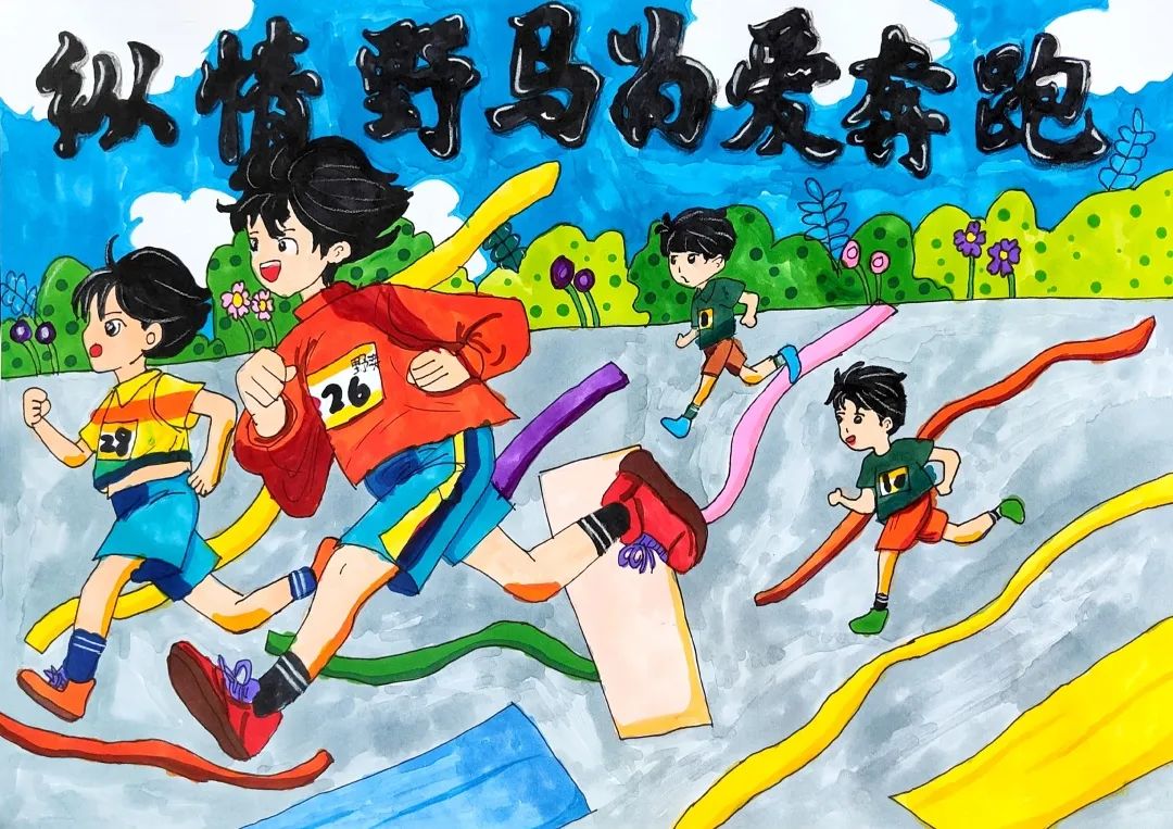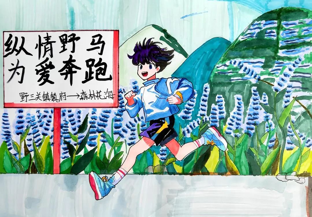 小小的画纸上,有戴着号码布的“小野马”在山间奔跑,有土家姑娘举着花环为跑者加油,还有会吹凉风的赛道与会笑的云朵……