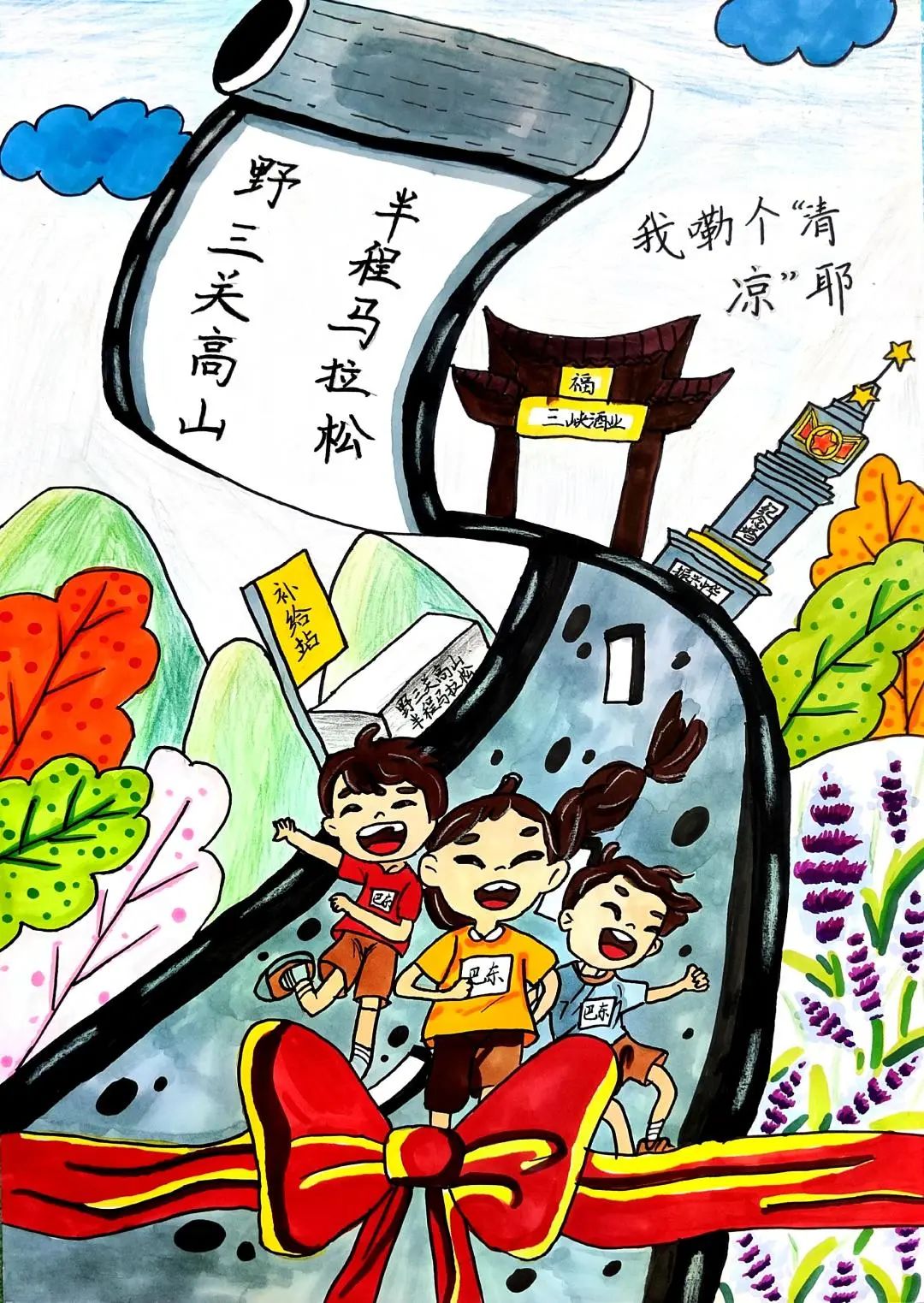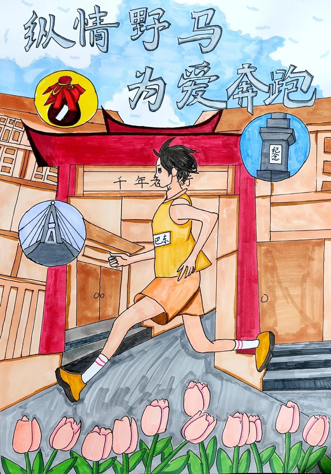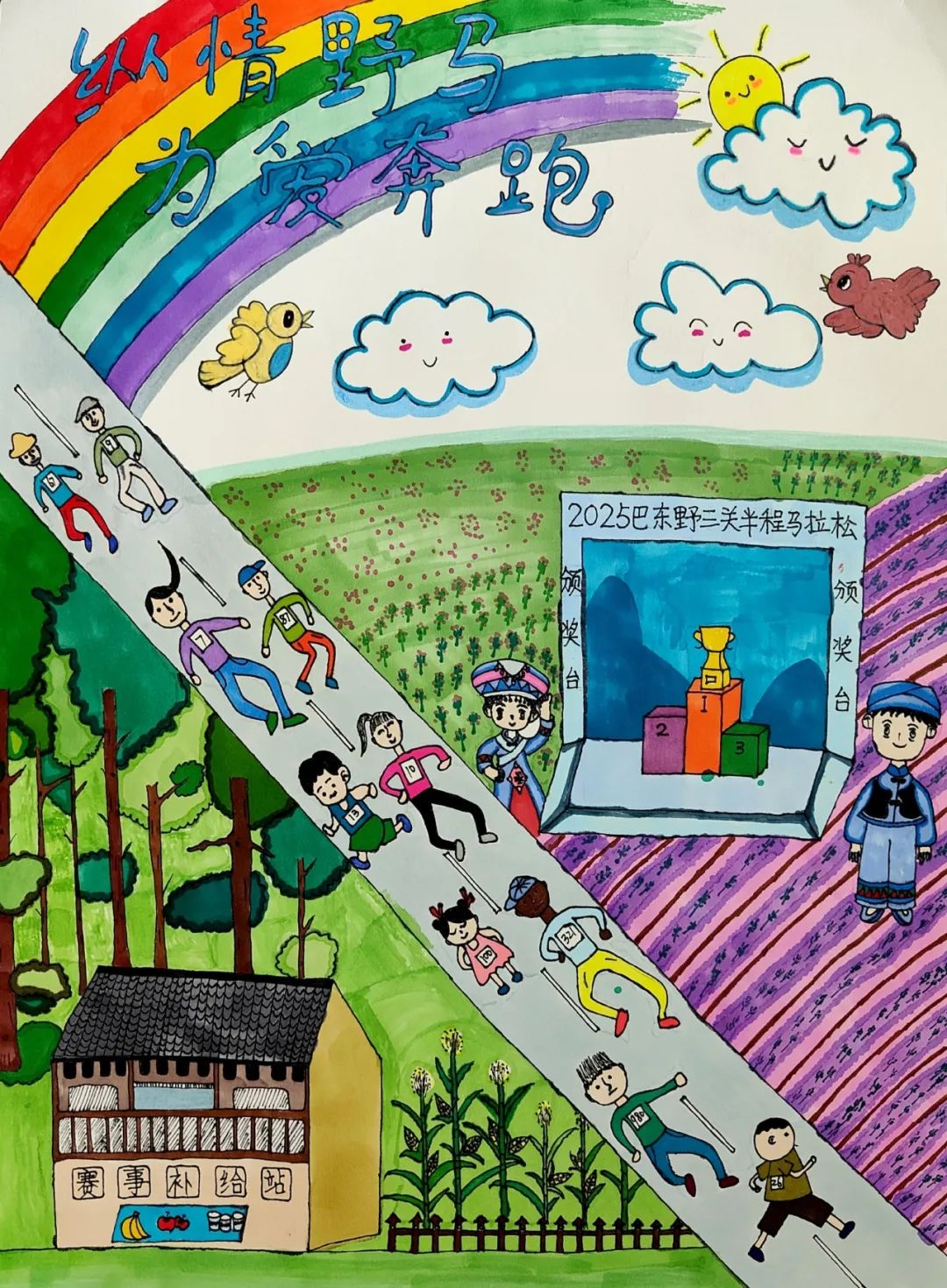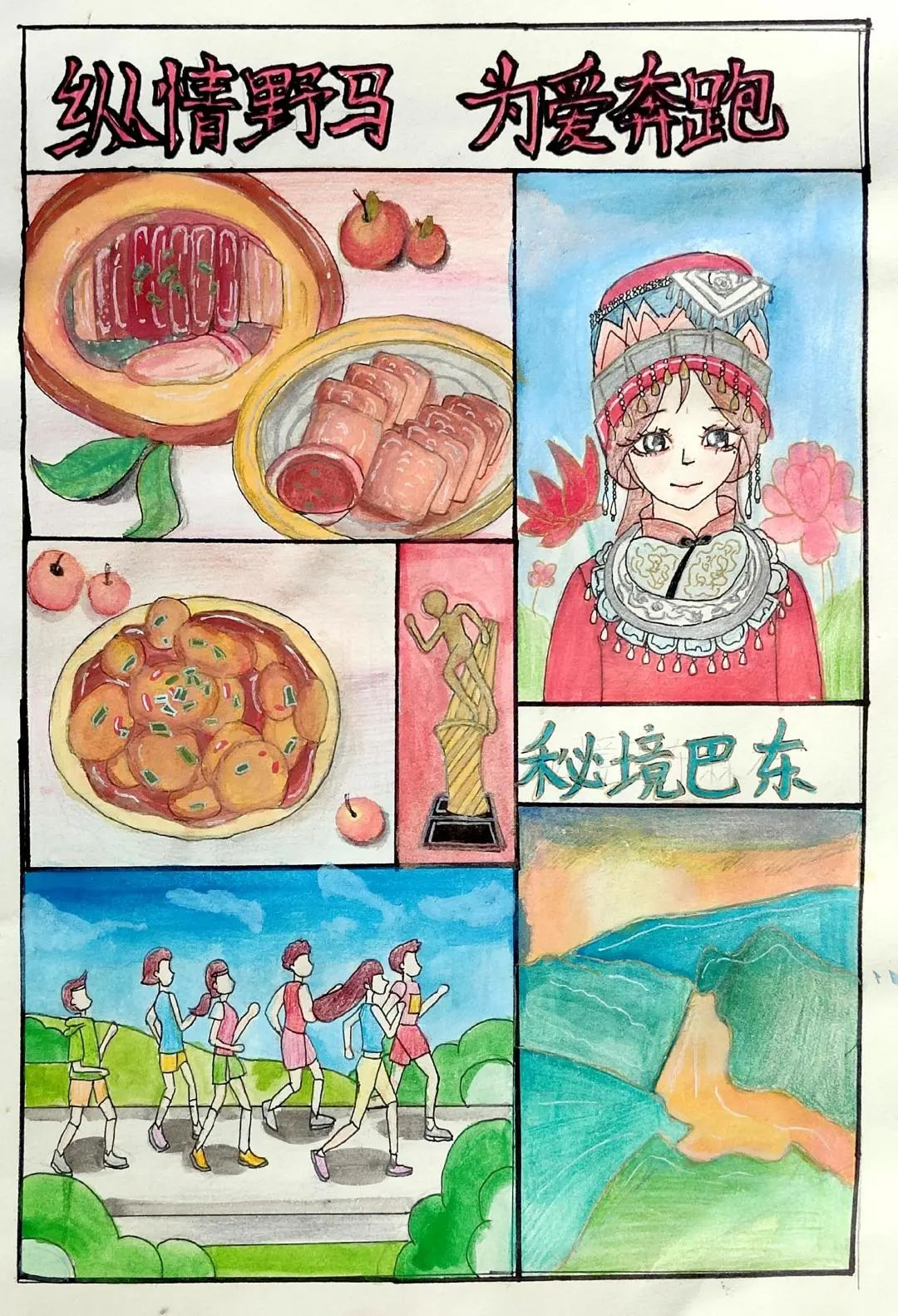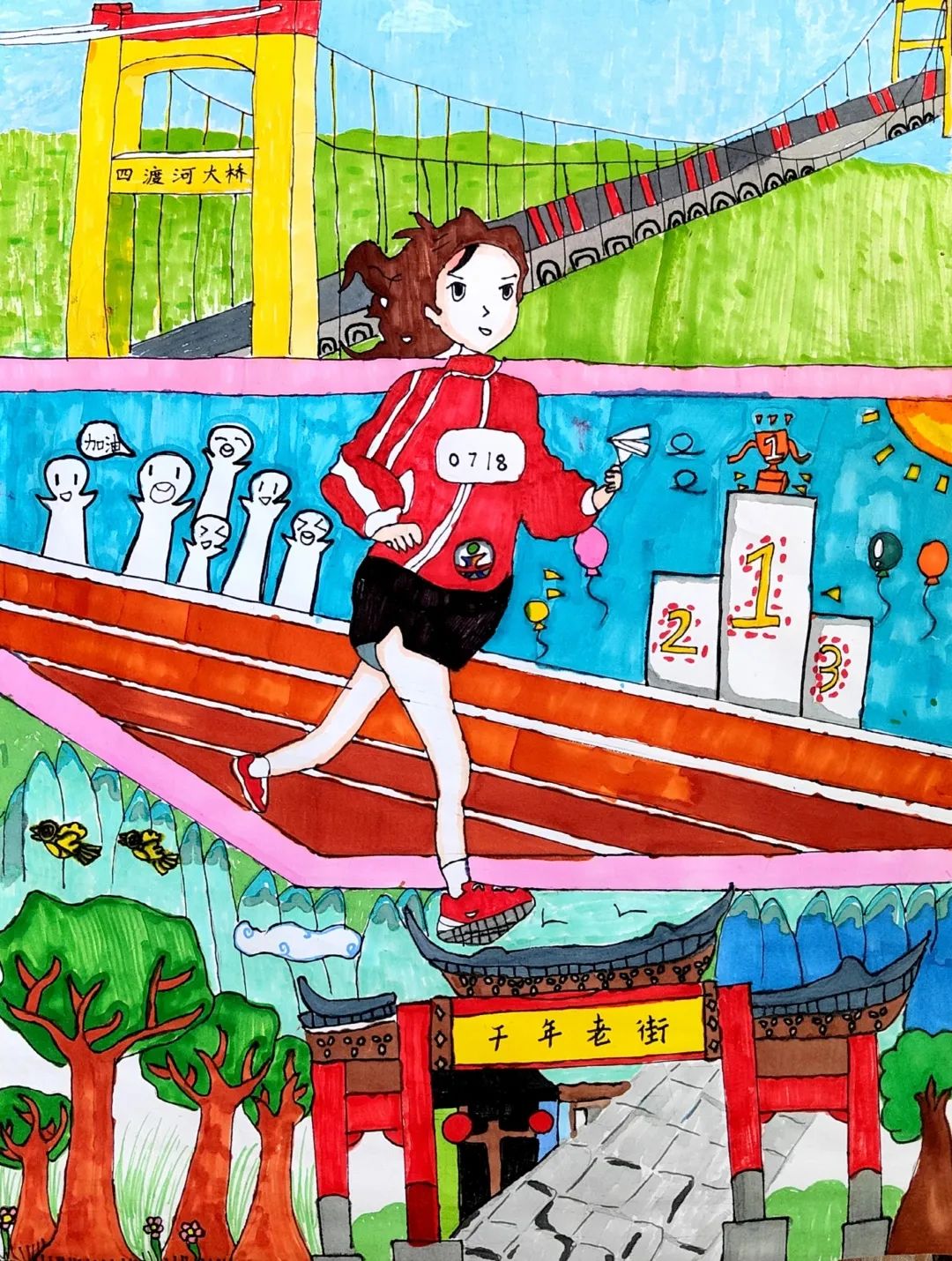 小小的画纸上,有戴着号码布的“小野马”在山间奔跑,有土家姑娘举着花环为跑者加油,还有会吹凉风的赛道与会笑的云朵……