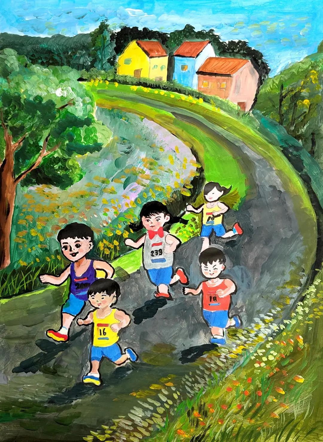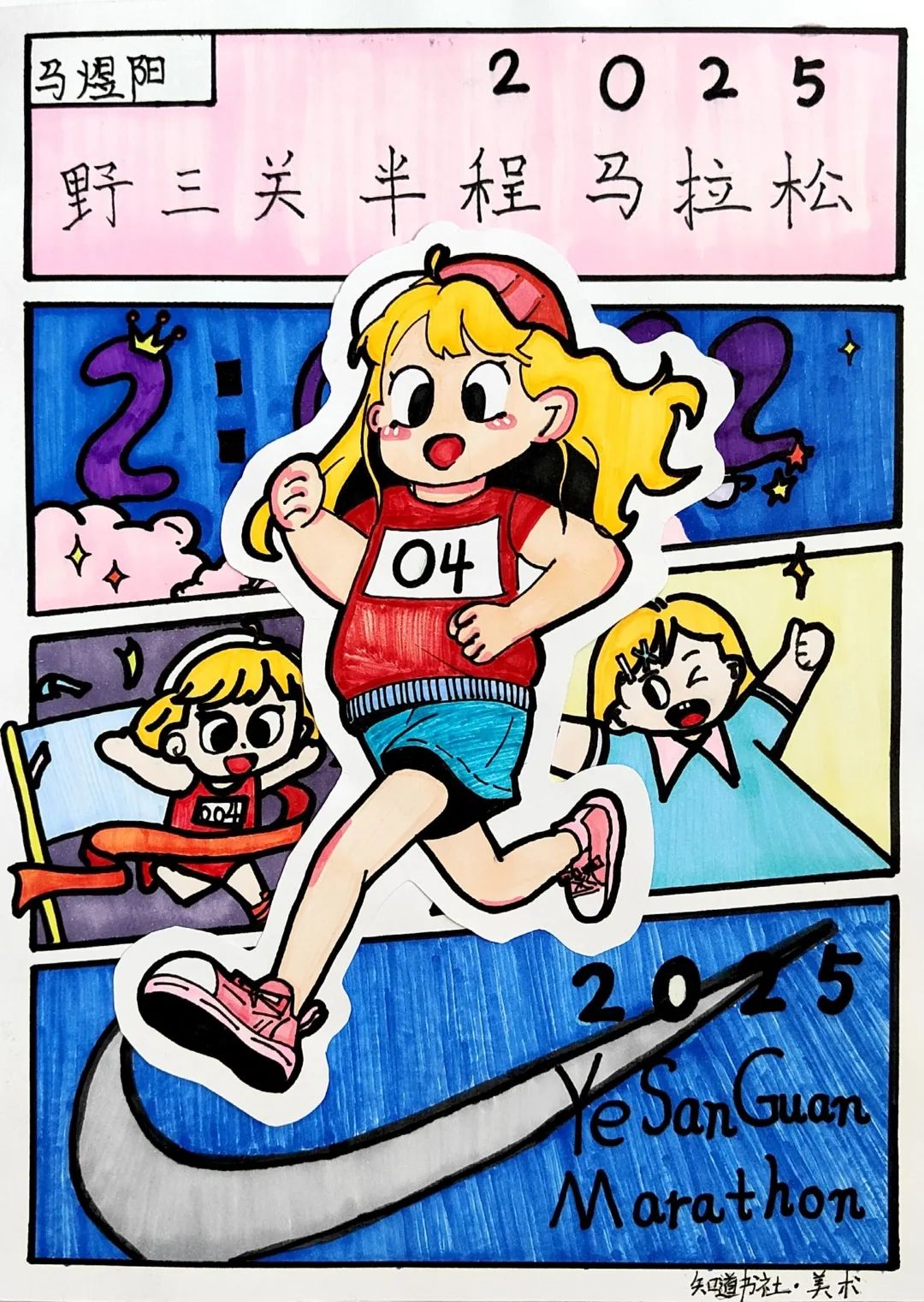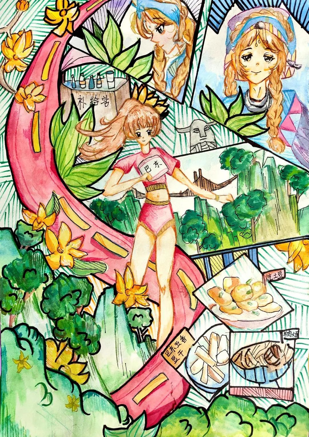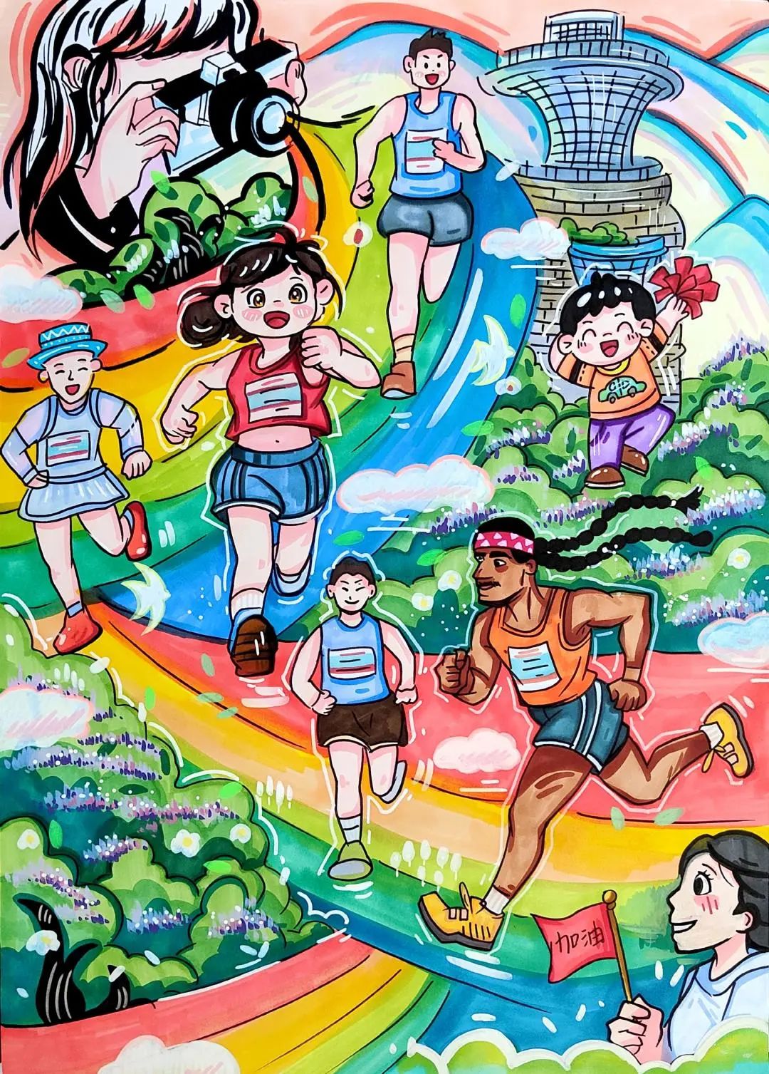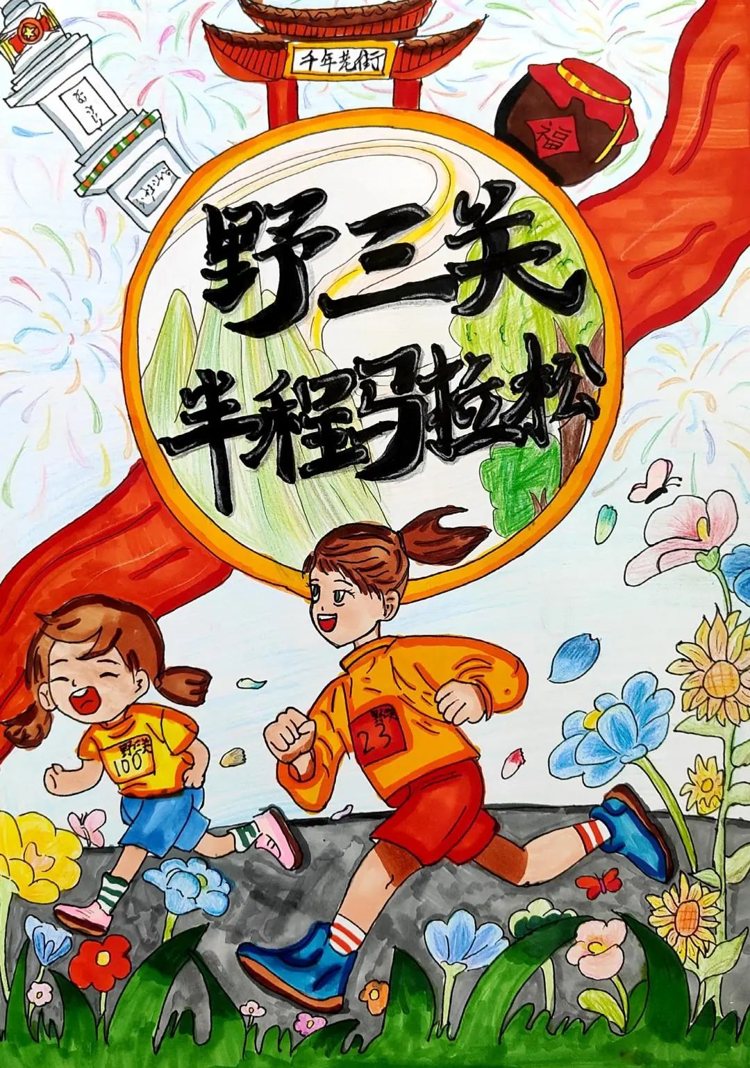 小小的画纸上,有戴着号码布的“小野马”在山间奔跑,有土家姑娘举着花环为跑者加油,还有会吹凉风的赛道与会笑的云朵……