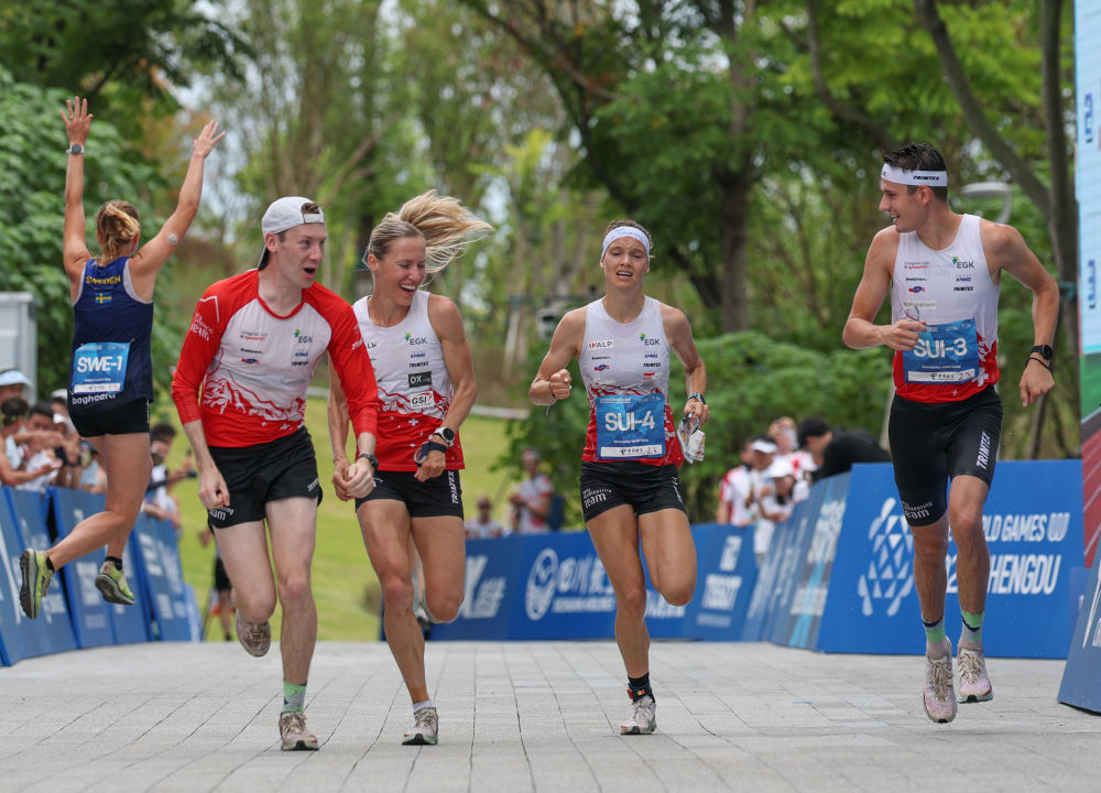 8月11日,瑞士队三名完赛选手在比赛终点处与最后一棒队员埃伯索尔德(右二)一同冲过终点。当日,2025年成都世运会定向混合短距离接力决赛在成都东部新区定向赛场举行。新华社记者 陈诚 摄