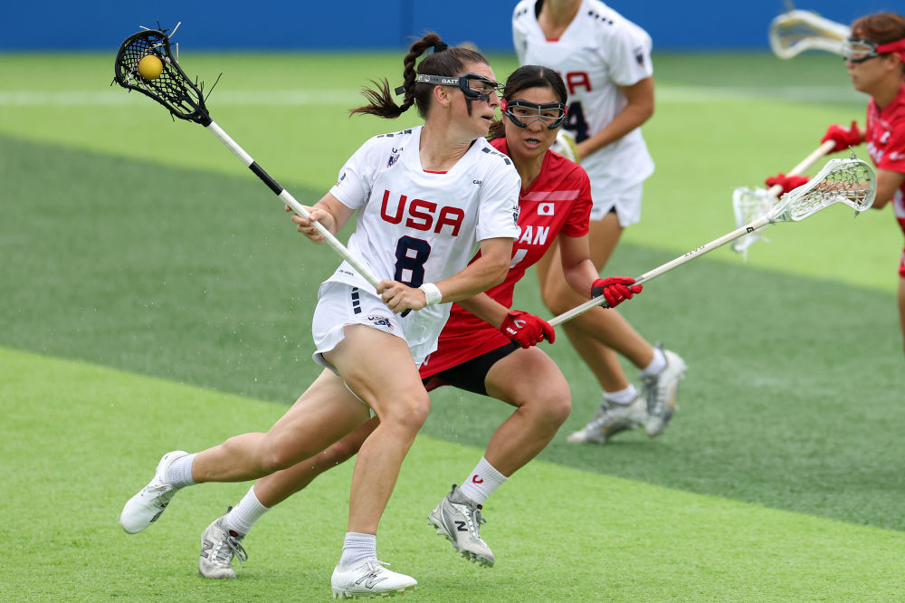 8月10日,美国棍网球队球员诺思(左一)在美国队与日本队的比赛中进攻。 新华社记者 陈斌 摄