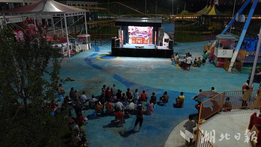 这是8月10日崇阳县提琴戏传承发展中心在城西一处游乐广场内开展提琴戏演出时的场景。尽管天气炎热,但是台下依然坐满了不少戏迷,台上唱得宛转悠扬,台下听得如痴如醉。