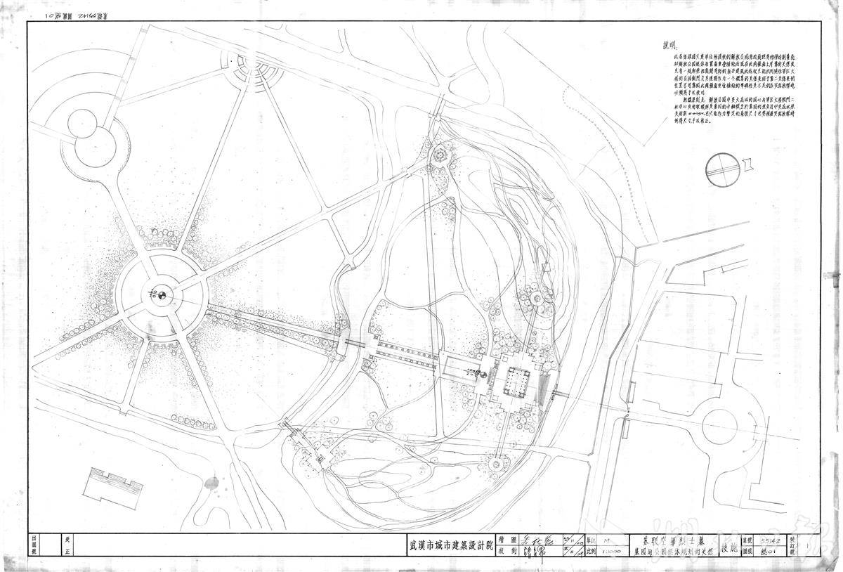 第三份档案,是武汉市城市建筑设计院现场踏勘的记录手稿,其中写道:灵堂广场标高较坟墓广场标高高出2.8米,拟利用开掘河道的土方填起,碑前水池所挖的土方也在灵堂广场区内,预计完工后可将原有之“朝梅”“夕桂”联成一气。