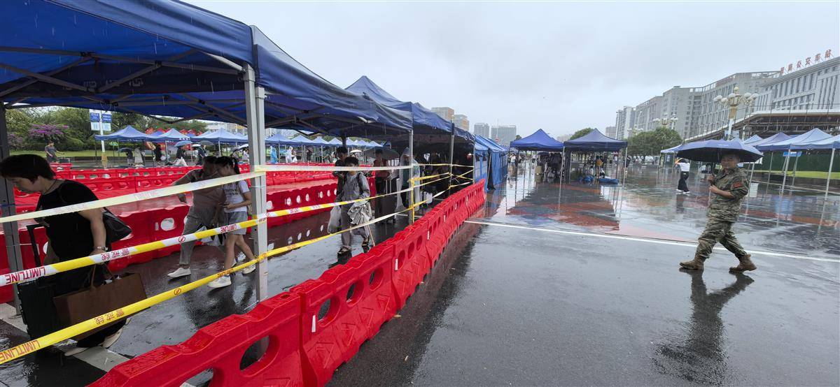 8月12日,恩施市持续降雨。恩施站进站口前,旅客们在几位“迷彩服”的引导下,有序进站。