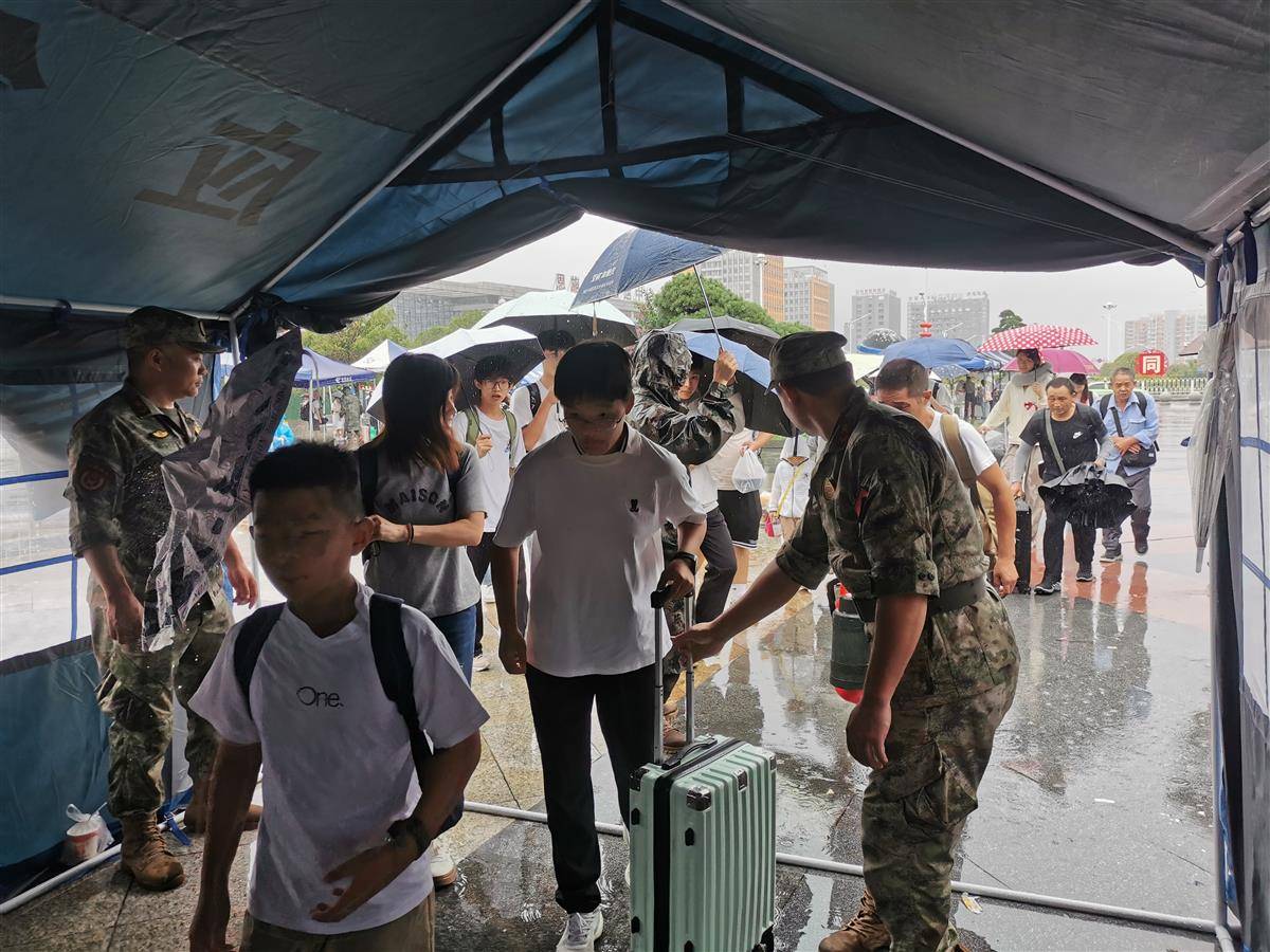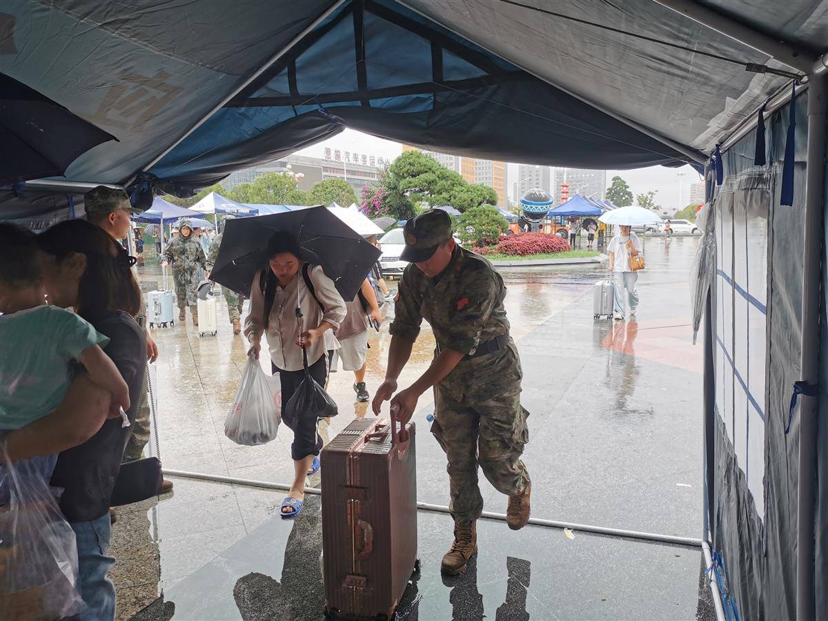 不到半个小时,30名民兵带上几十顶帐篷、矿泉水、面包、雨衣等物资,迅速赶到恩施站站前广场集结。“那时雨很大,候车大厅里挤满了旅客,一些旅客在大厅外的屋檐下避雨。”雷斌说,应急排的民兵到达现场后,迅速和应急部门工作人员一起搭建帐篷。在附近商户的支援下,80多顶帐篷被搭建在火车站的进、出站口。车站工作人员还在站外设置了液晶屏,实时播报列车到站情况。