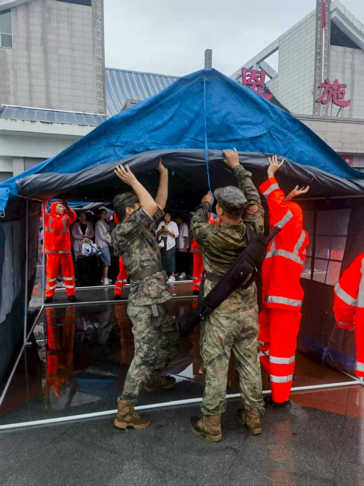恩施民兵雨中支起帐篷。