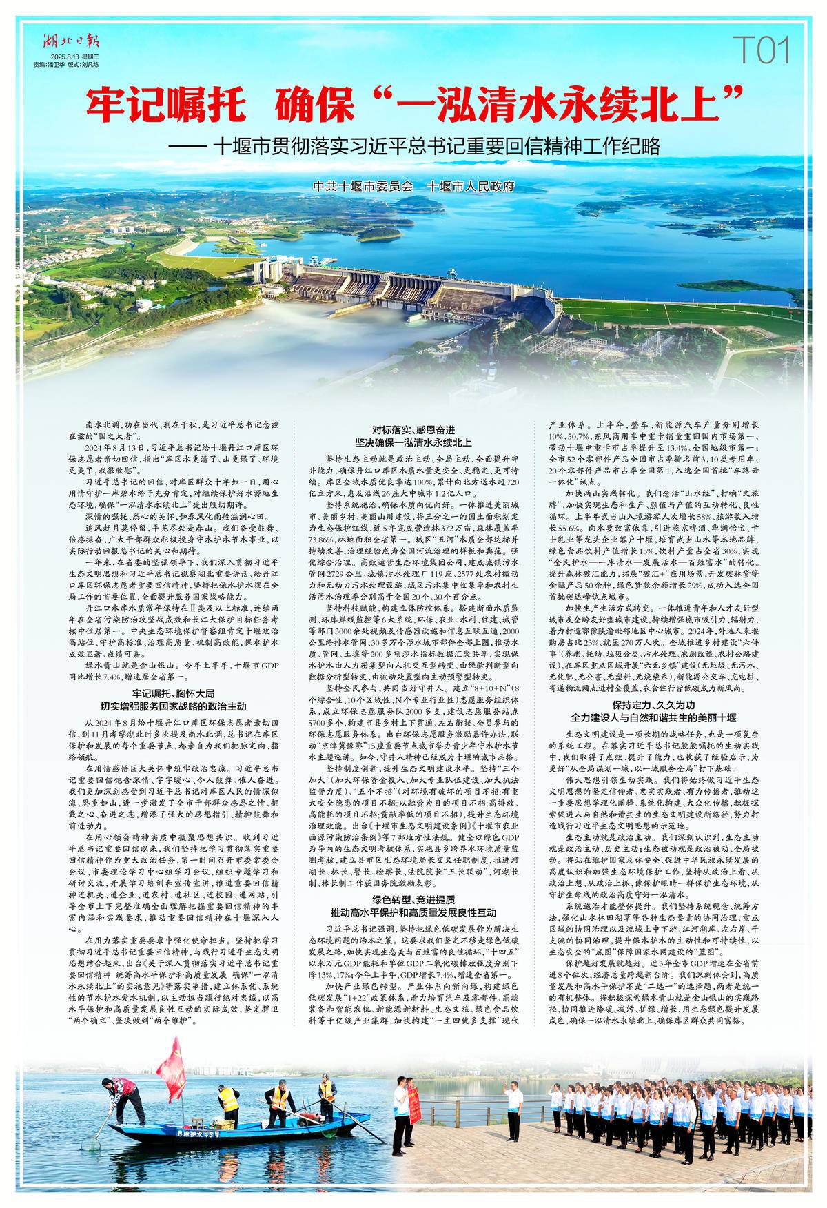 2025年8月13日,湖北日报推出《牢记嘱托 确保“一泓清水永续北上” 》特刊,全面展现在省委的坚强领导下,十堰全市上下、驻堰高校等单位、企业,深入贯彻落实习近平生态文明思想和习近平总书记视察湖北重要讲话、给丹江口库区的环保志愿者重要回信精神,坚持把保水护水摆在全局工作的首要位置,全面提升服务国家战略能力,以实际行动回报总书记的关心和嘱托,确保“一泓清水永续北上”的生动实践。