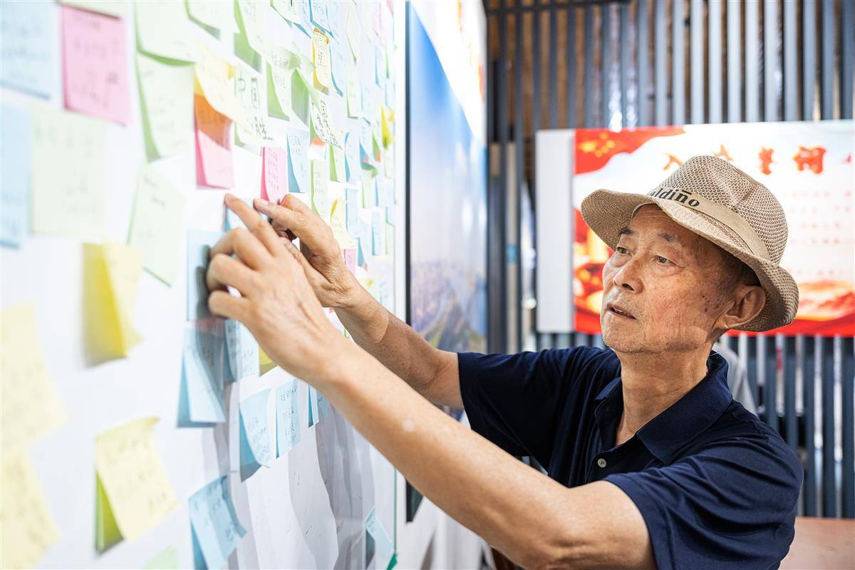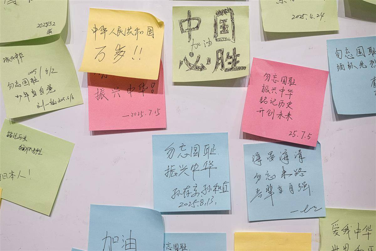 8月13日,孙存京在武汉受降堂的寄语板上张贴寄语“勿忘国耻 振兴中华”。(湖北日报全媒记者 任勇 摄)