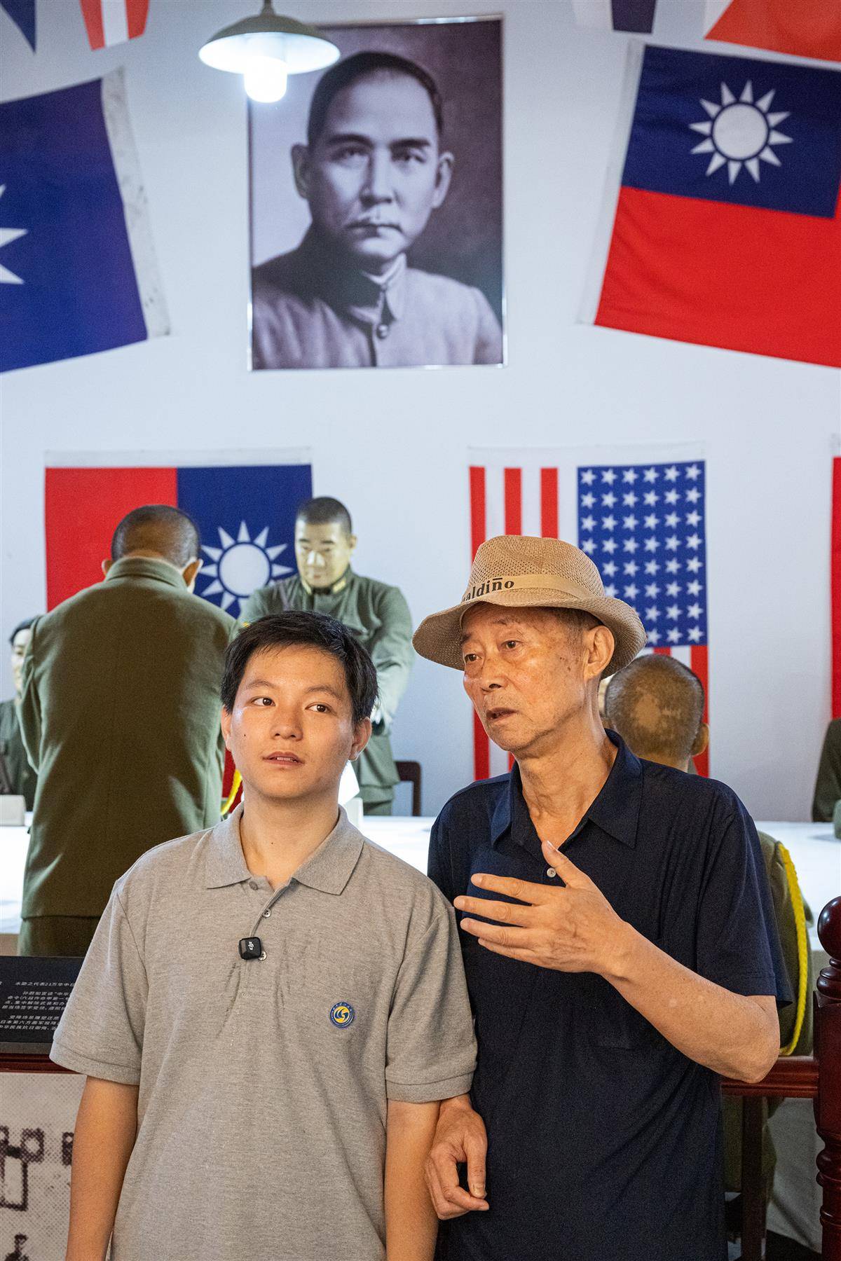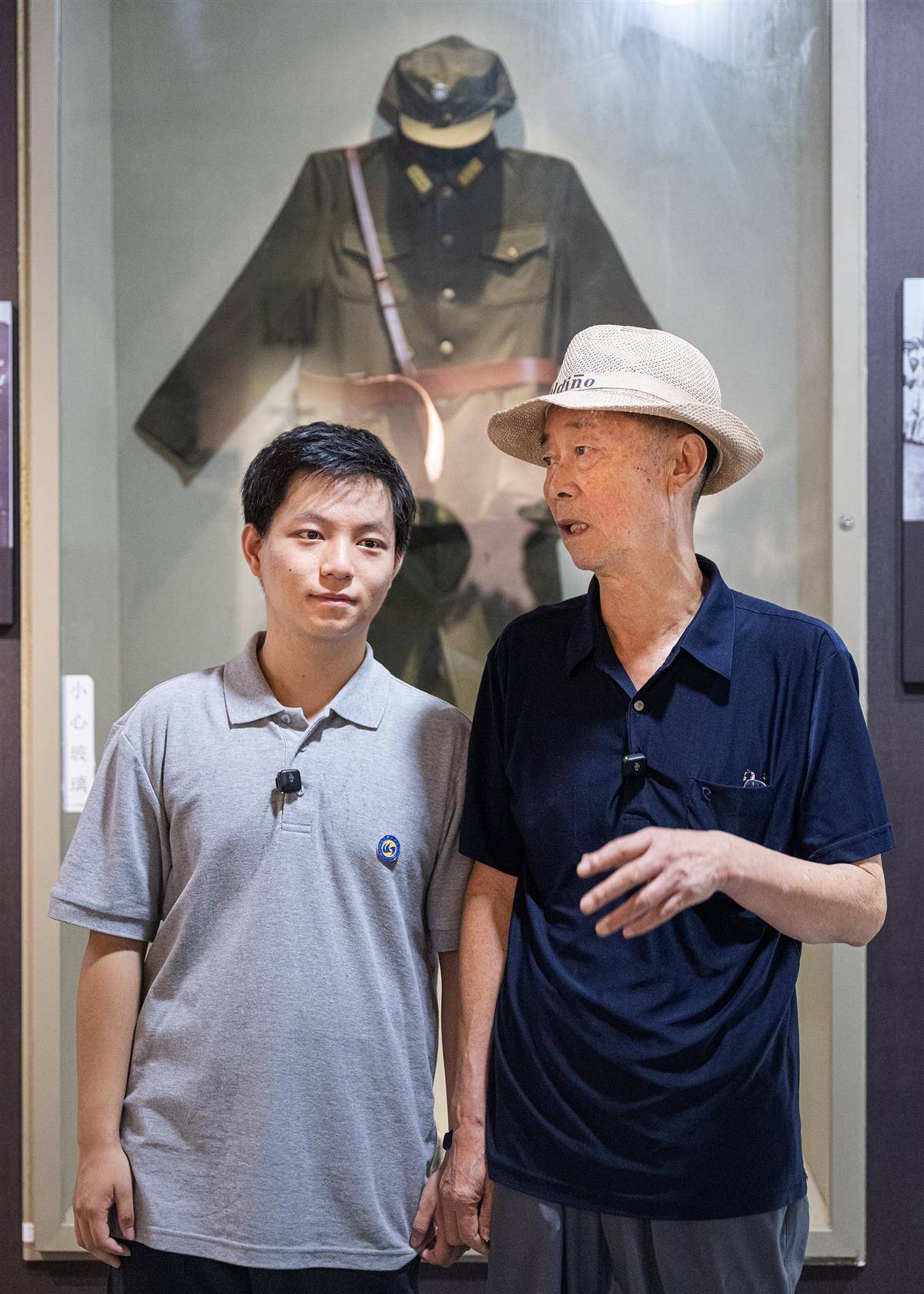 8月13日,孙存京(右)和孙子孙和直(左)从西安来到武汉中山公园的受降堂,重温抗战历史。他们身后展出的是孙蔚如将军曾经穿过的军装。(湖北日报全媒记者 任勇 摄)