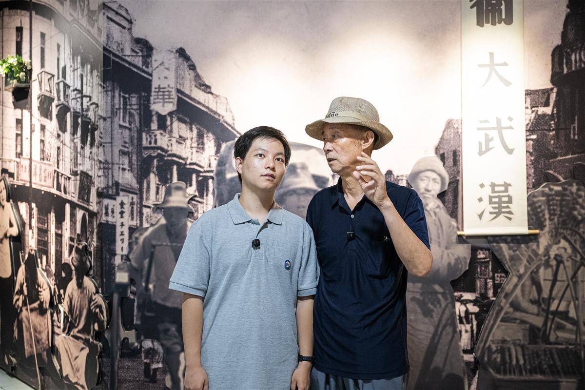 8月13日,孙存京(右)和孙子孙和直(左)从西安来到武汉中山公园的受降堂,重温抗战历史。(湖北日报全媒记者 任勇 摄)