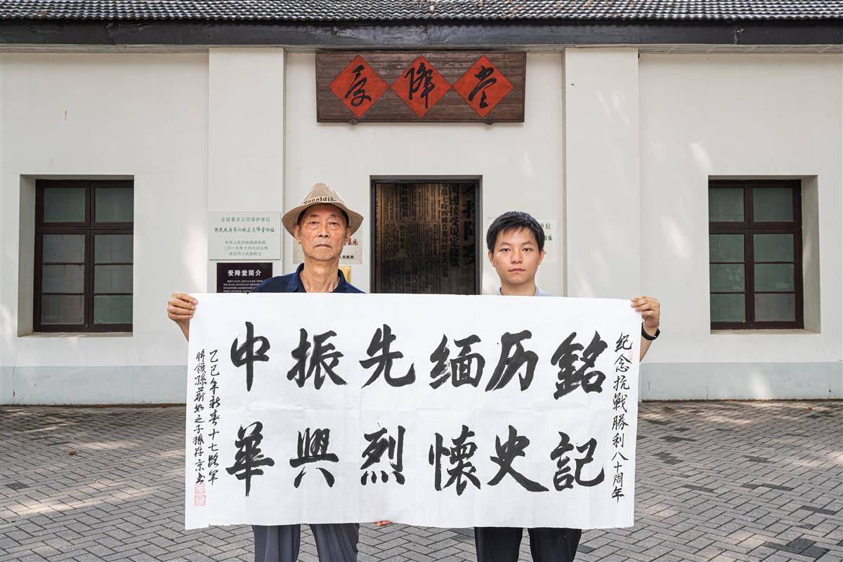 8月13日,孙存京和孙子孙和直在武汉受降堂前展示其书写的毛笔字“铭记历史 缅怀先烈 振兴中华”,纪念抗战胜利80周年。(湖北日报全媒记者 任勇 摄)
