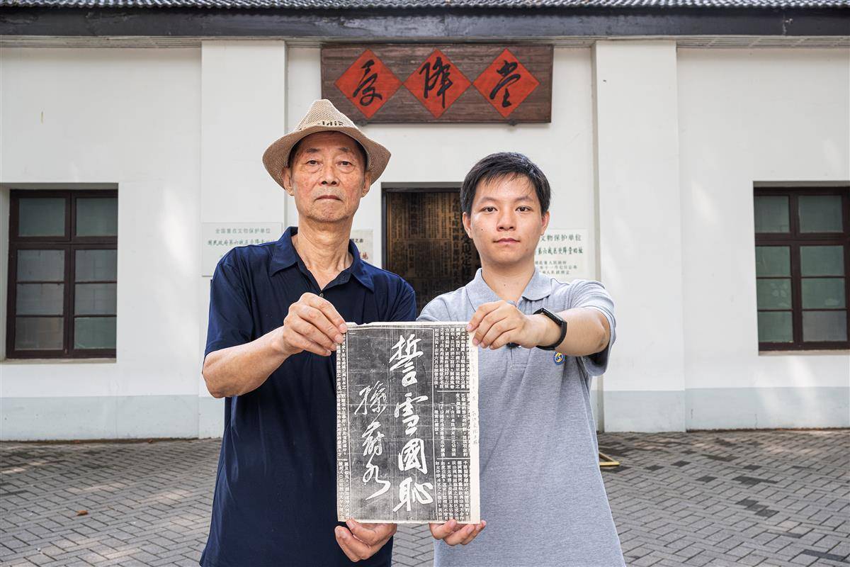 8月13日,孙存京和孙子孙和直在武汉受降堂前展示其收藏的1932年9月18日《西北文化日报》剪报,剪报上是孙蔚如将军书写的“誓雪国耻”四个字。(湖北日报全媒记者 任勇 摄)