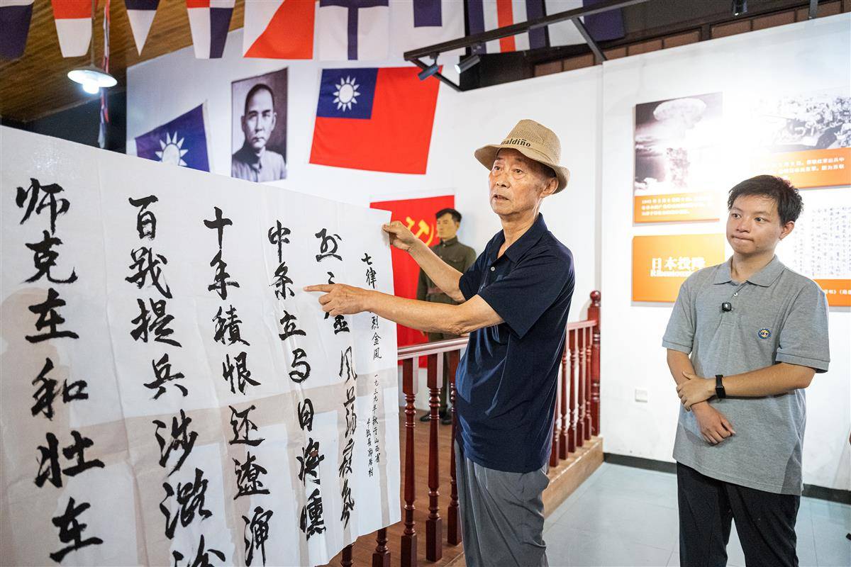 8月13日,孙存京手写了一首父亲孙蔚如将军的诗词,并现场为市民讲述。(湖北日报全媒记者 任勇 摄)