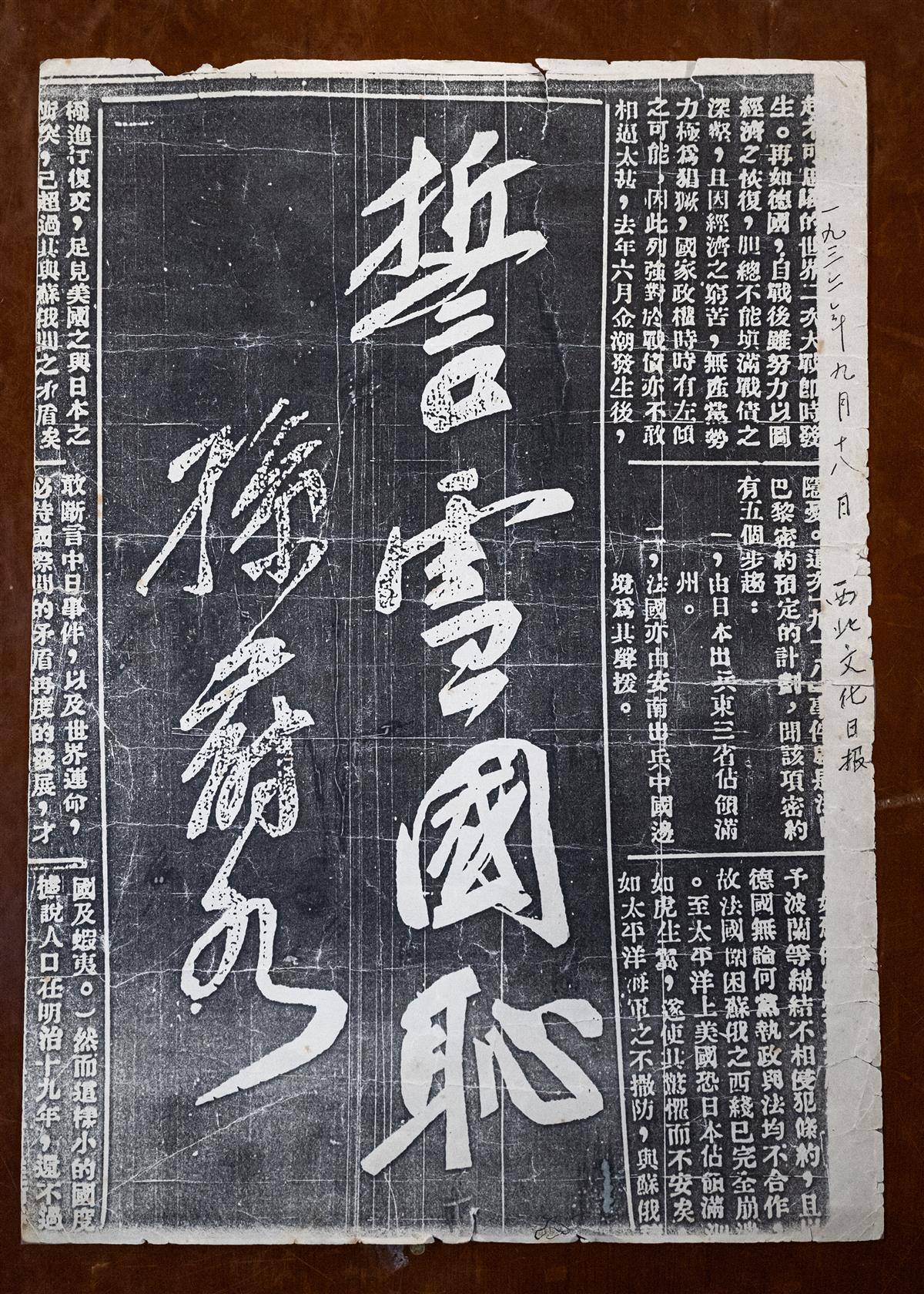 8月13日,孙存京收藏的1932年9月18日《西北文化日报》剪报,剪报上是孙蔚如将军书写的“誓雪国耻”四个字。(湖北日报全媒记者 任勇 摄)