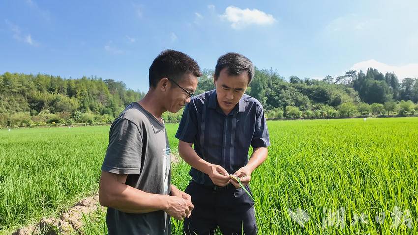8月14日,在崇阳县白霓镇桥头村,种粮大户杨清的稻田里绿意盎然,水稻长势喜人。田埂间,县农业农村局农艺师仔细察看水稻生长态势,轻轻拨开叶片,对每株水稻的叶色、茎秆硬度等生长指标逐项记录,同时对水稻病虫害情况进行细致诊断。农技人员还现场向杨清详细讲解病虫害防治技术要点,再三叮嘱他要密切关注天气变化,及时做好水稻田间管理和科学用药防治工作。